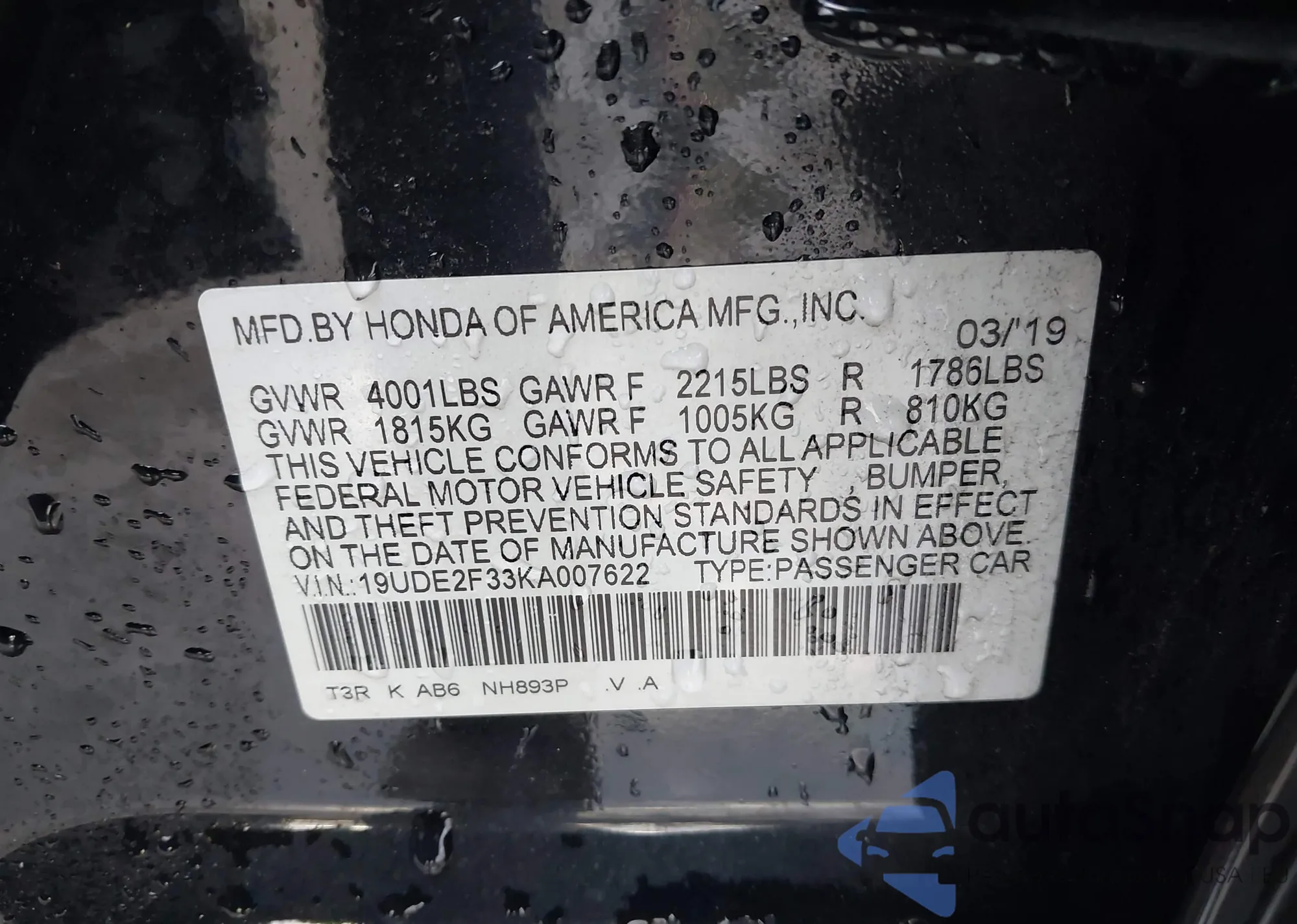 LOT: 44342227 VIN: 19UDE2F33HA006320