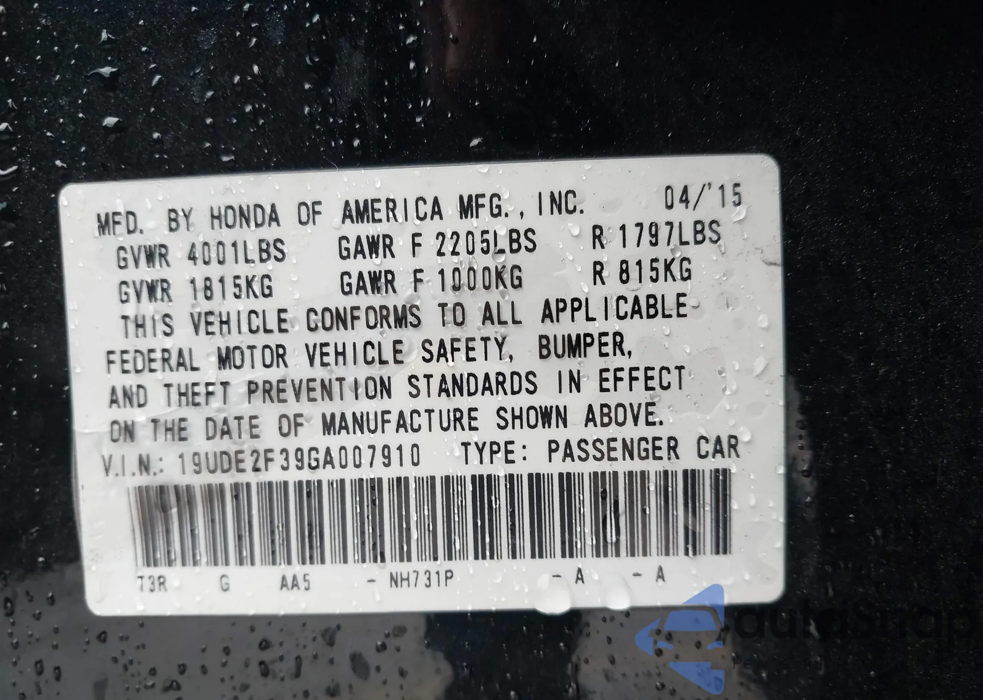 • VIN 19UDE2F39GA007910