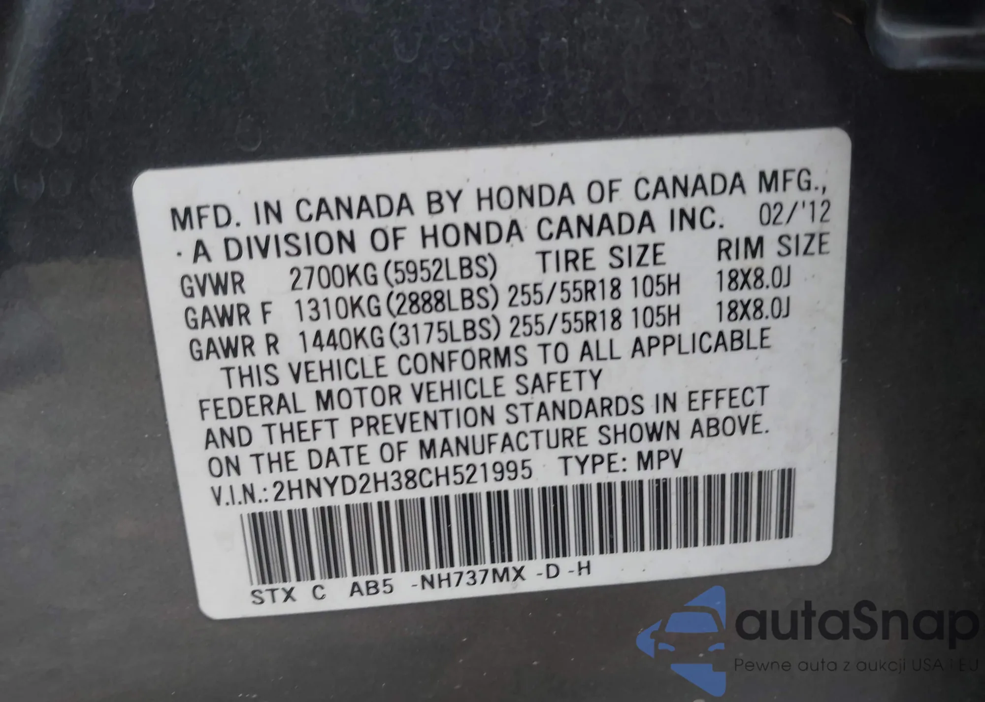 • VIN 2HNYD2H38CH521995