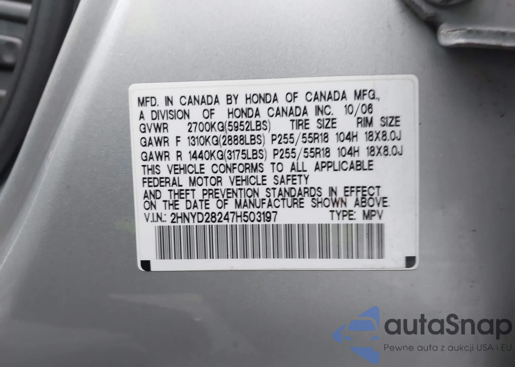 LOT: 43830015 VIN: 2HNYD28247H503197