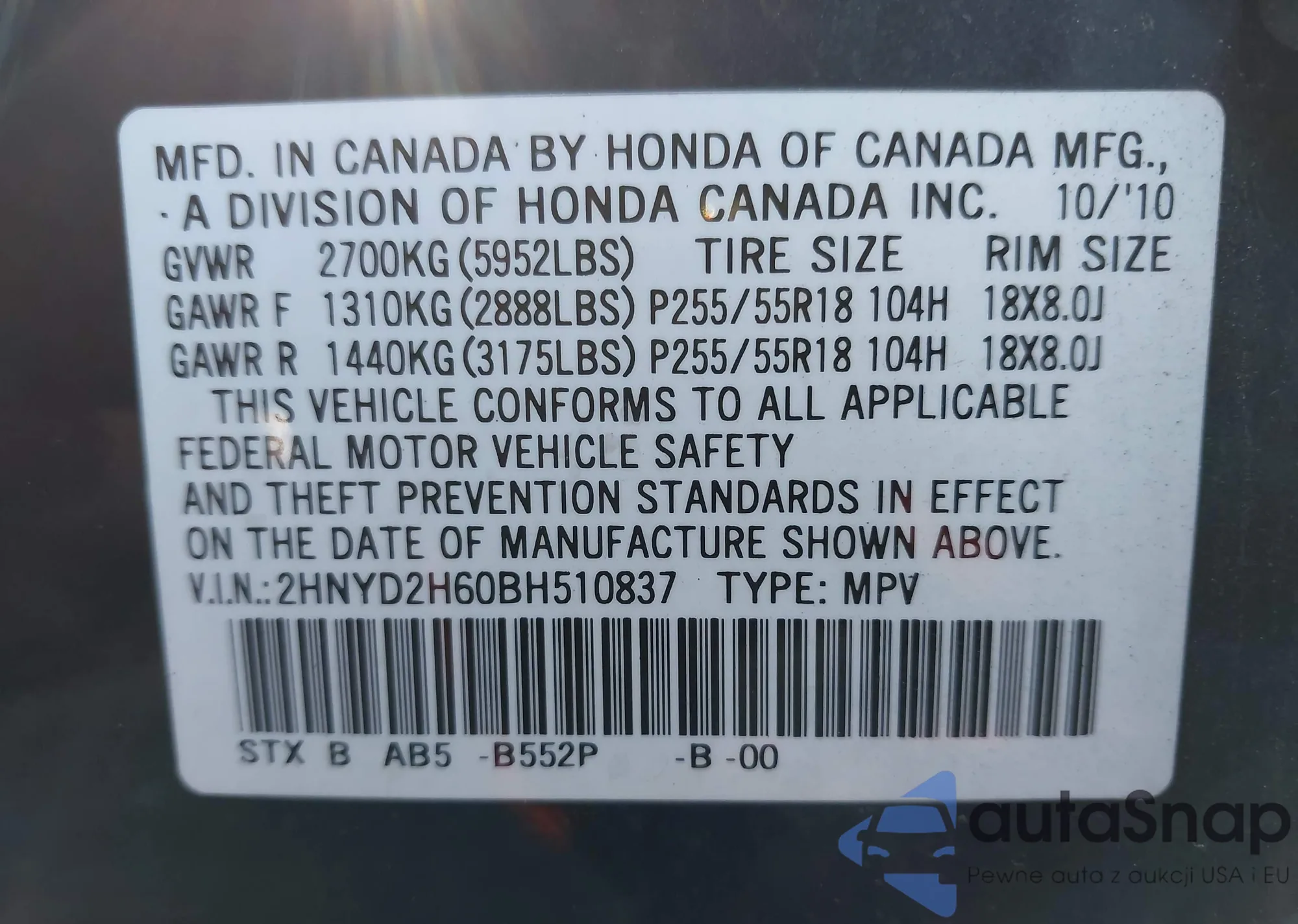 • VIN 2HNYD2H60BH510837