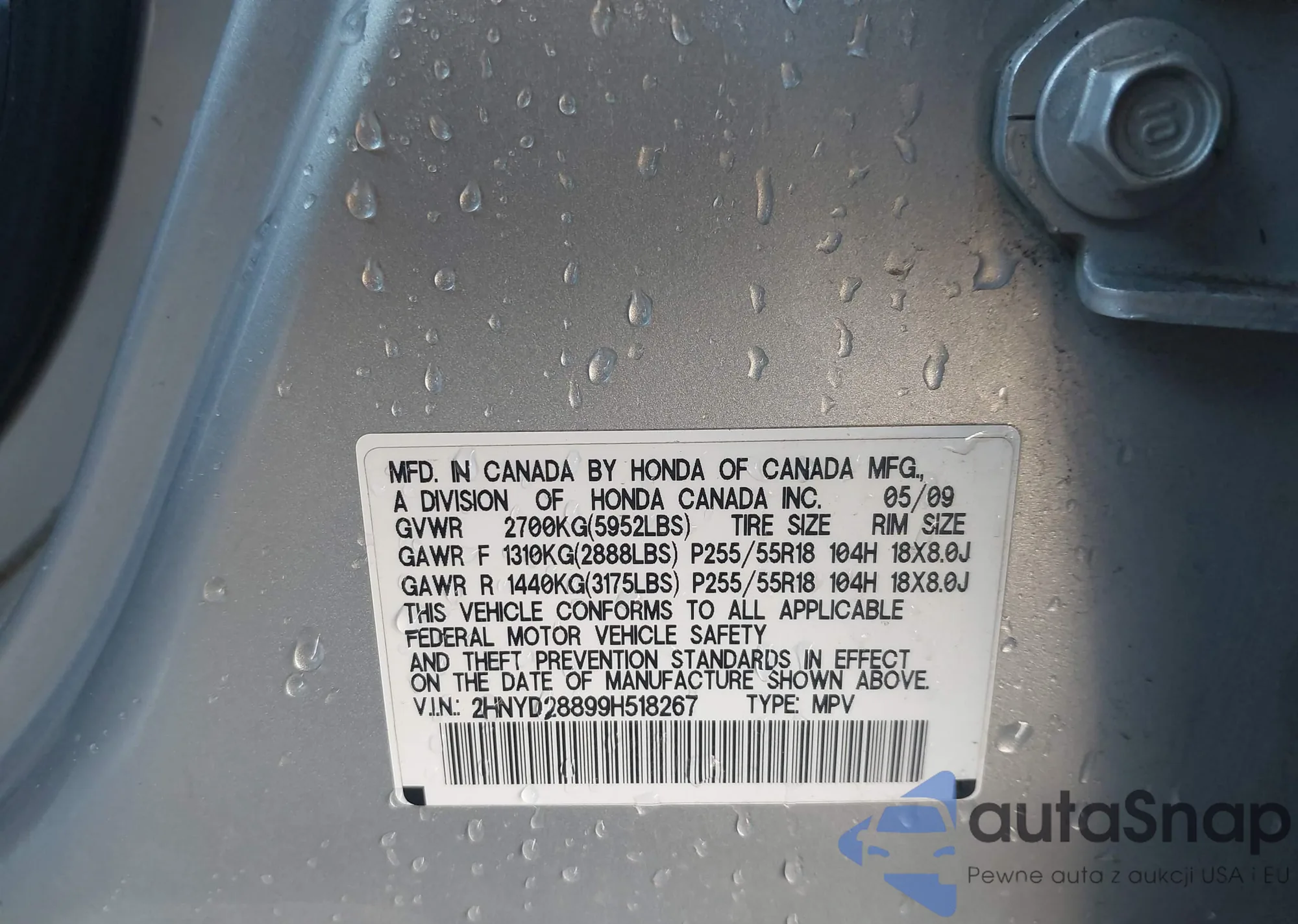 LOT: 44105268 VIN: 2HNYD28899H518267