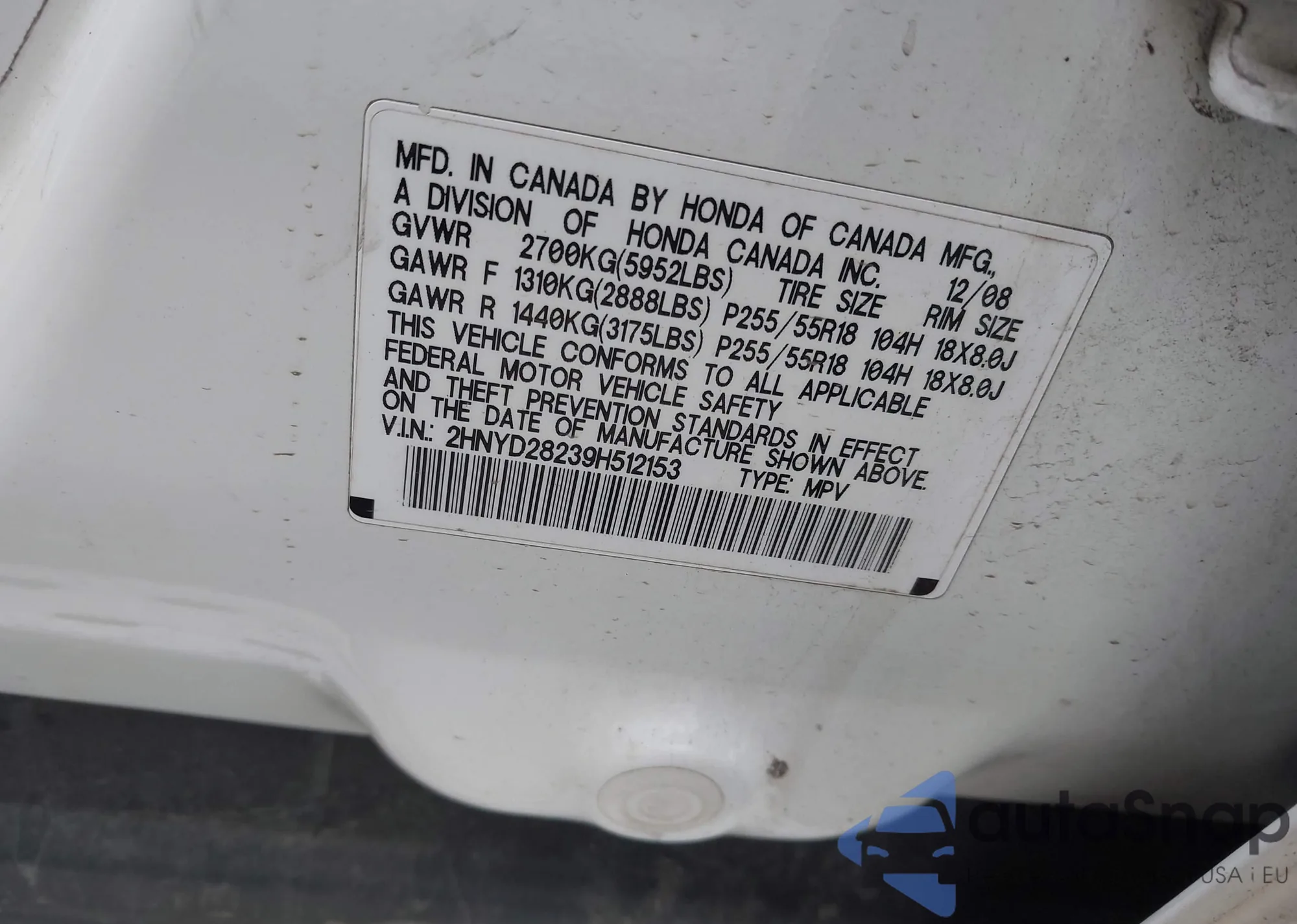 LOT: 44144998 VIN: 2HNYD283X8H521519
