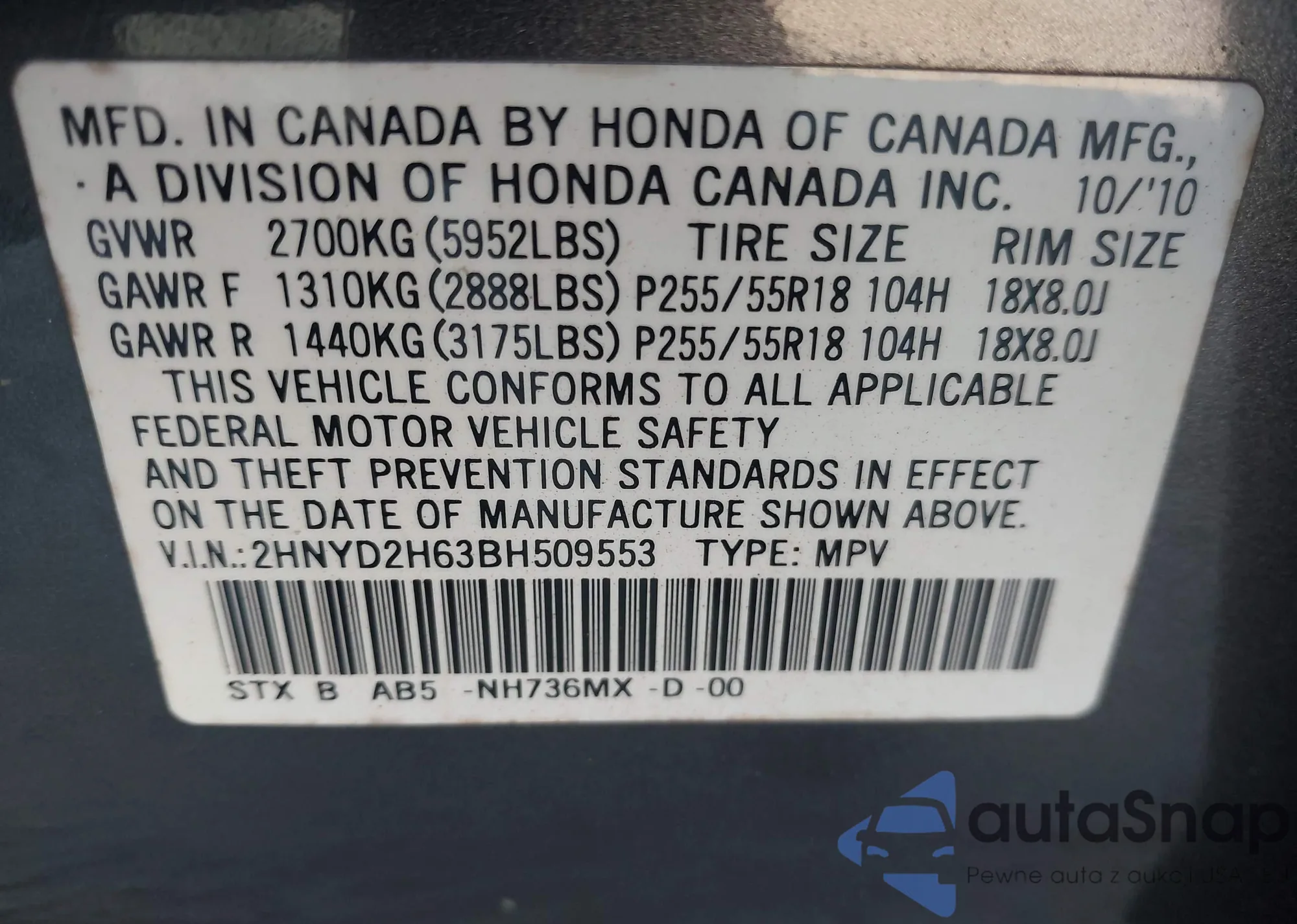 LOT: 44125150 VIN: 2HNYD2H69BH537762