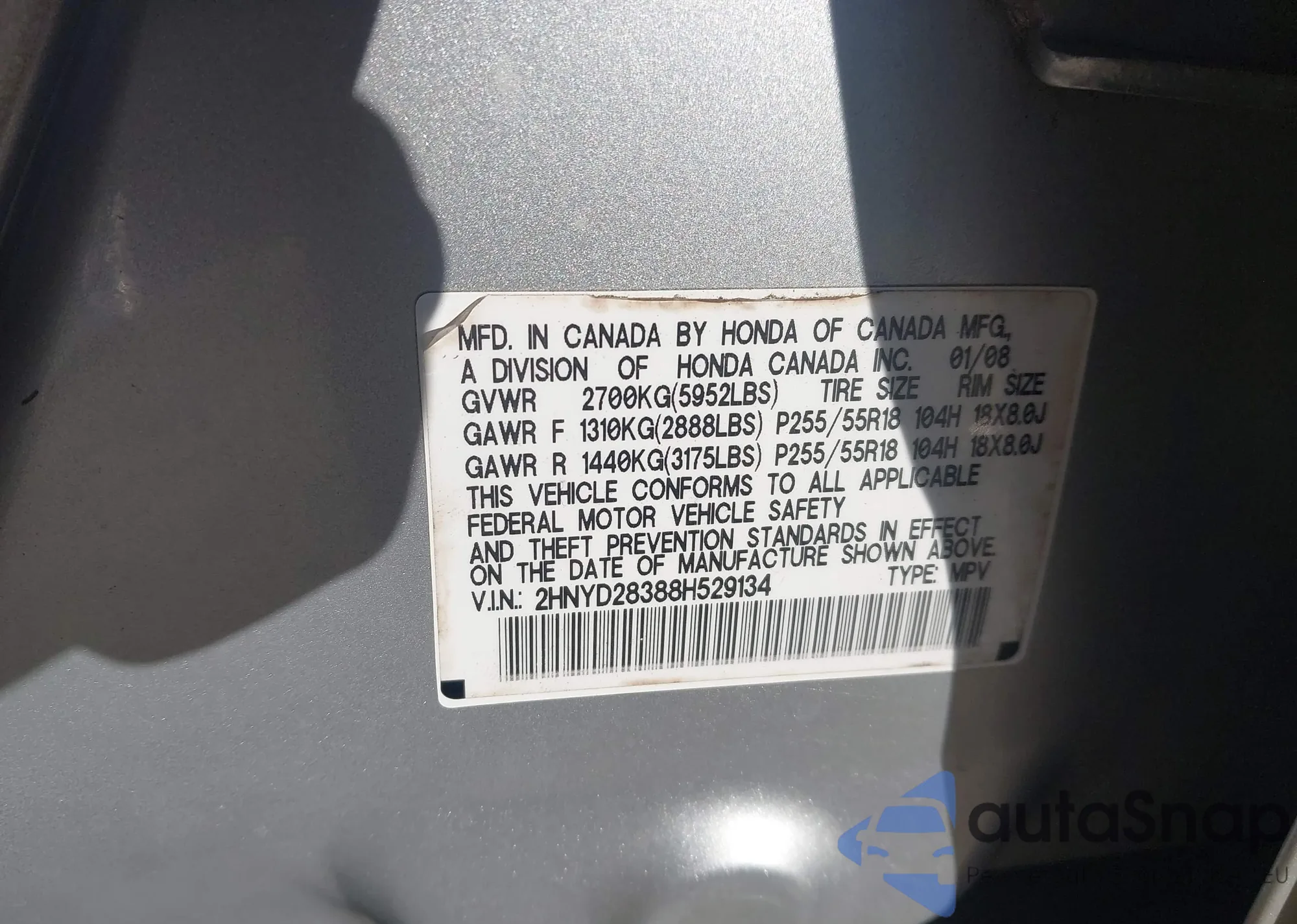 LOT: 44114568 VIN: 2HNYD28358H524957