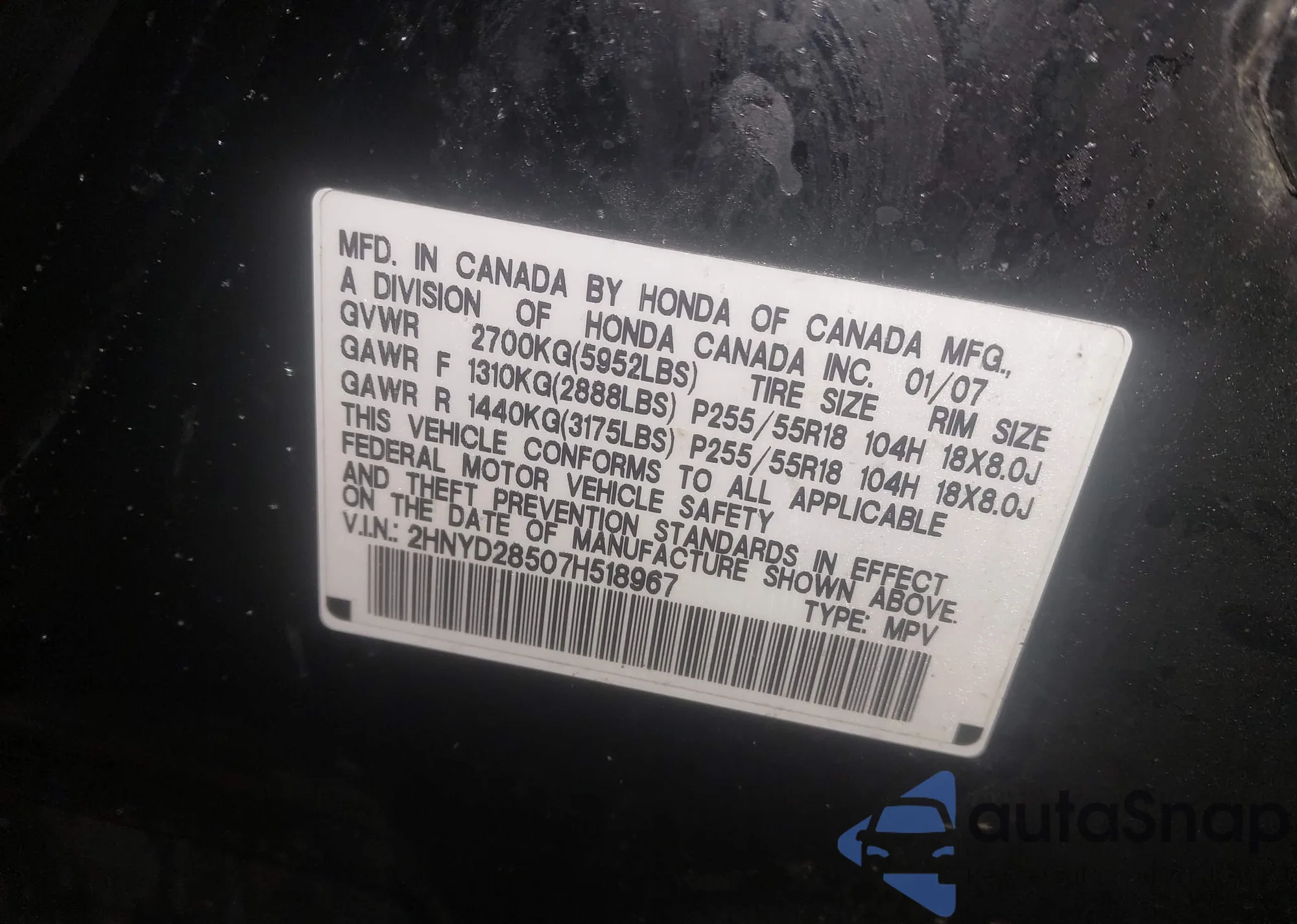 LOT: 44217361 VIN: 2HNYD28507H518967