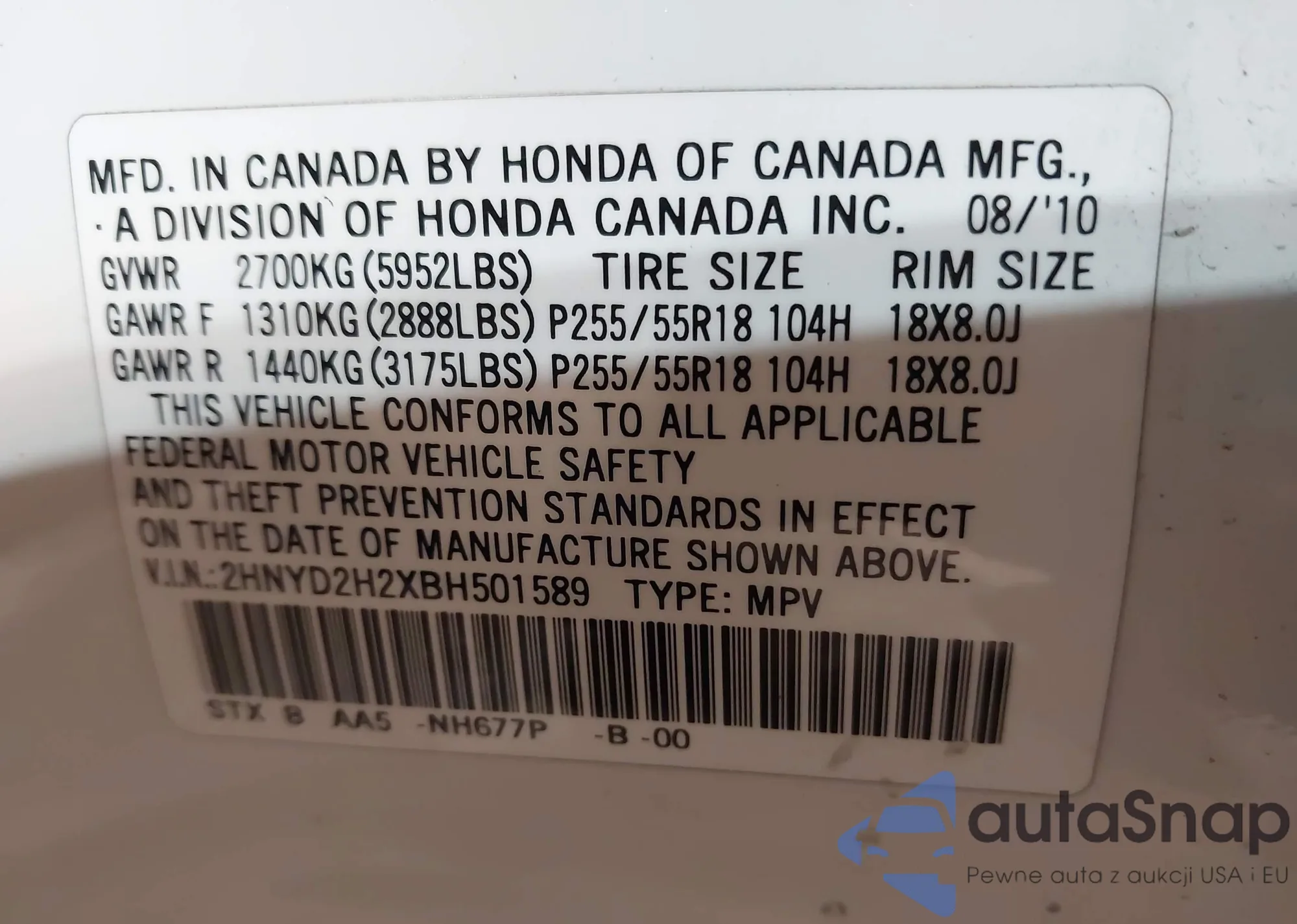• VIN 2HNYD2H25AH534210
