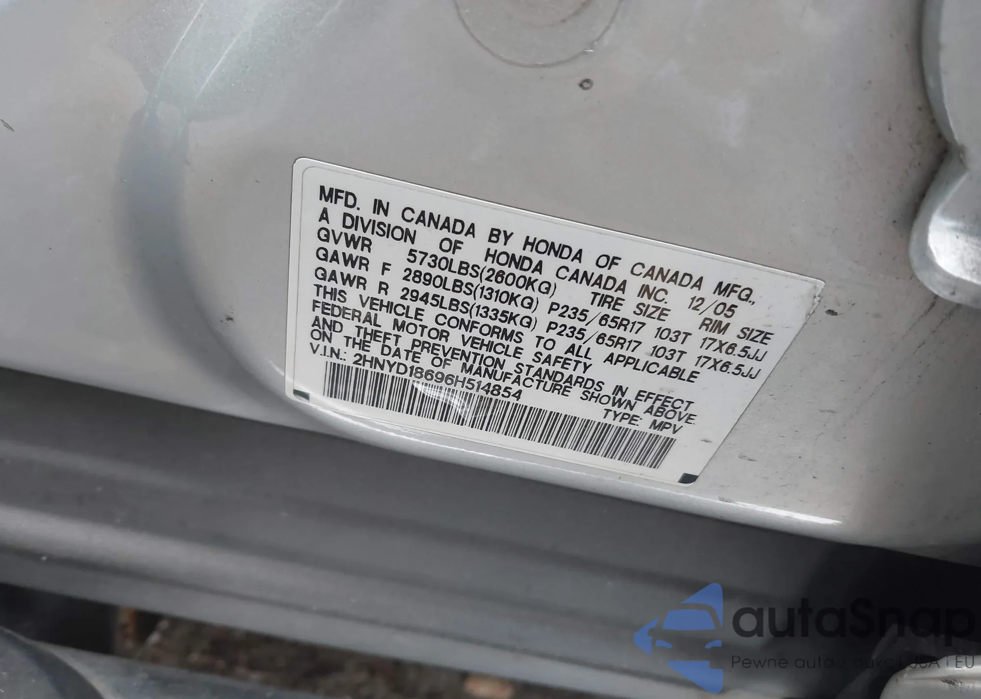 LOT: 43264253 VIN: 2HNYD18696H514854