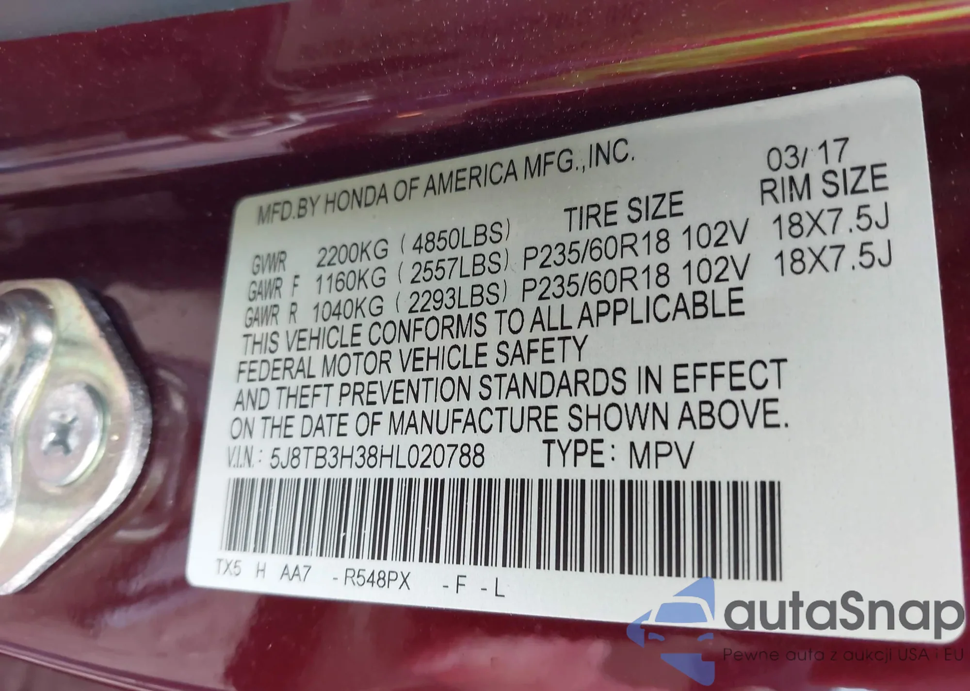 • VIN 5J8TB3H38HL020788