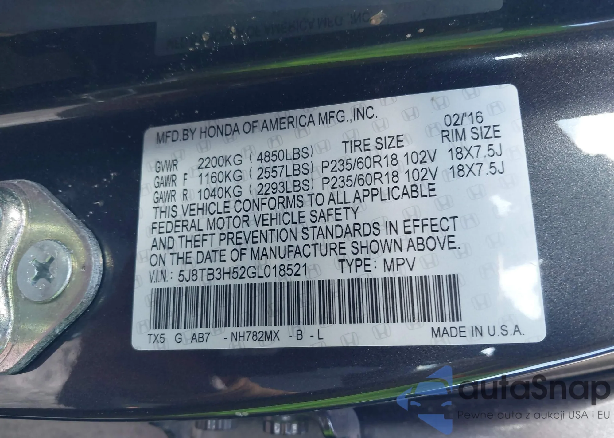 • VIN 5J8TB3H52GL018521