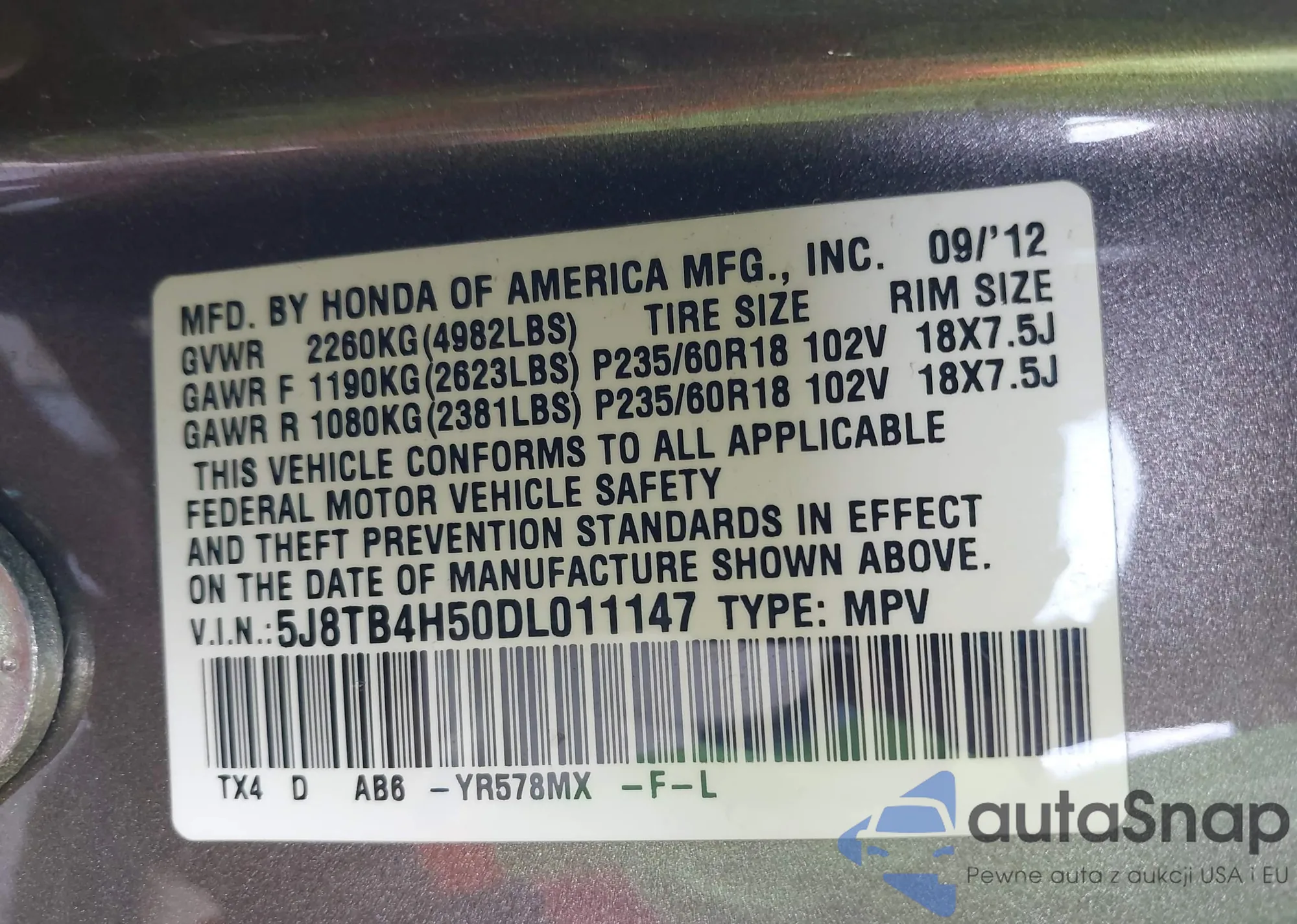 • VIN 5J8TB4H50DL011147