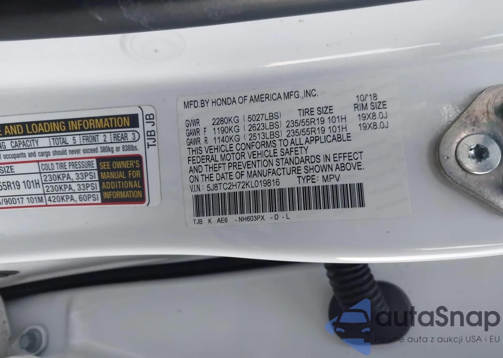 • VIN 5J8TC2H72KL019816