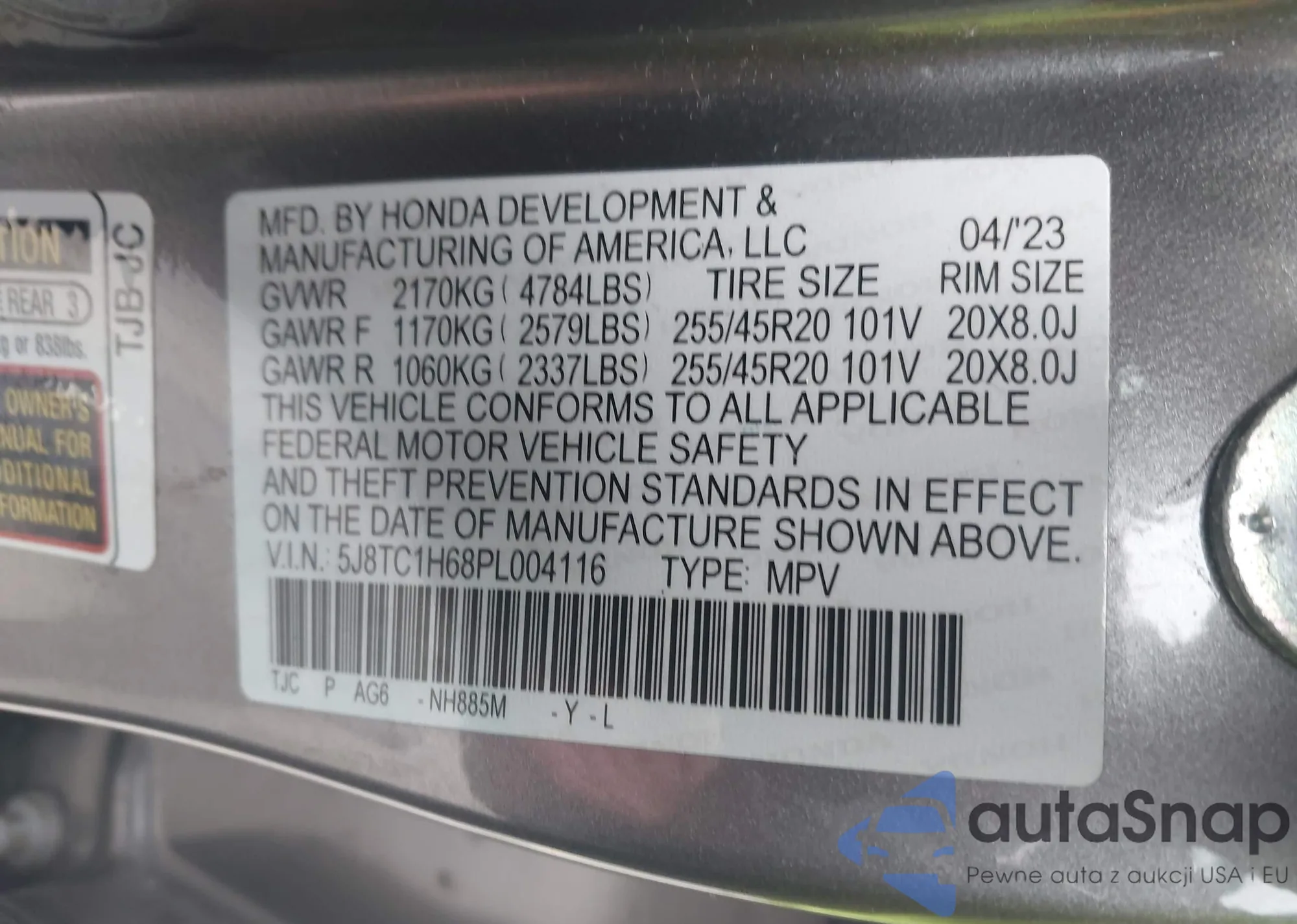 LOT: 43879421 VIN: 5J8TC1H68PL004116
