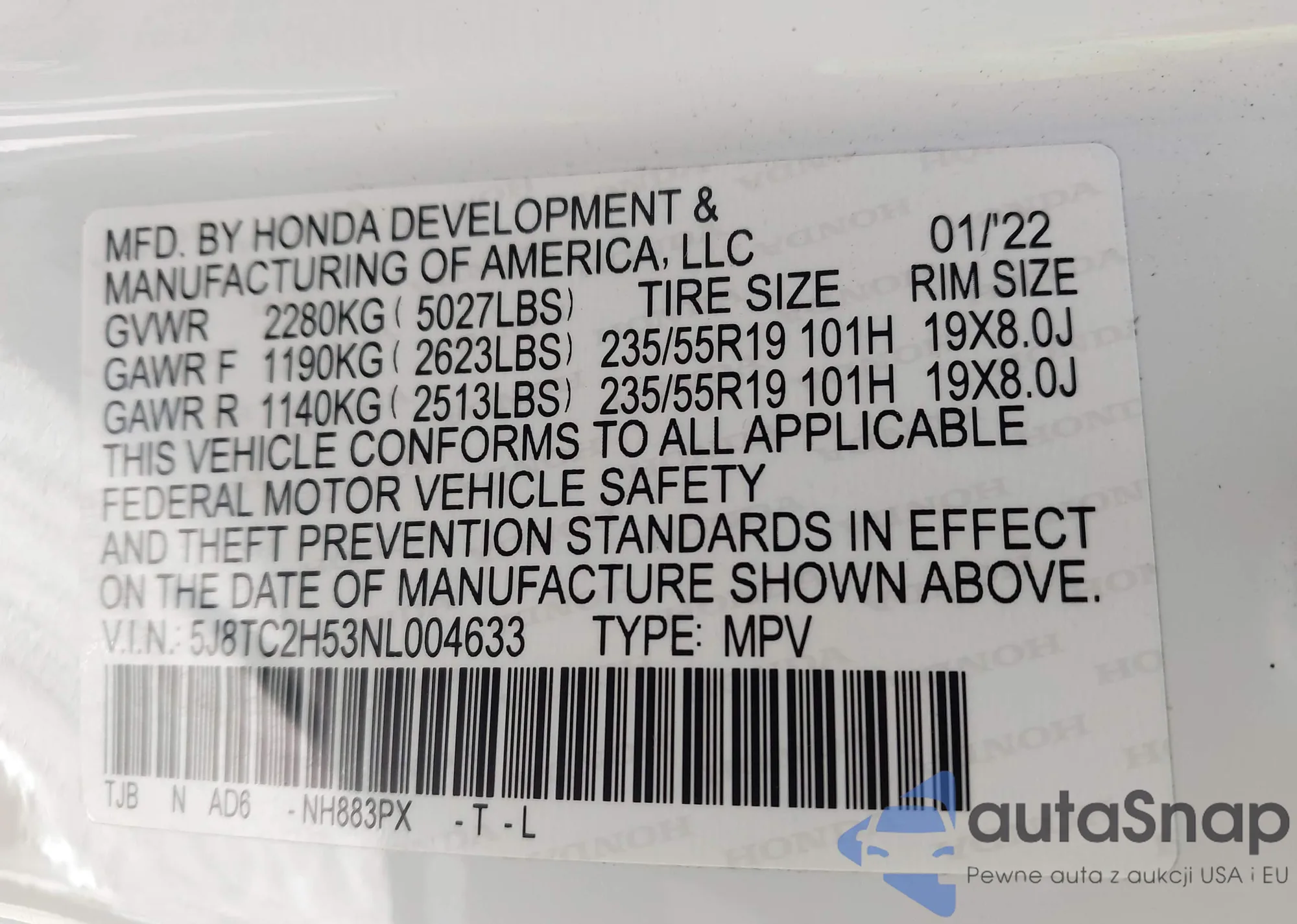 • VIN 5J8TC2H53NL004633
