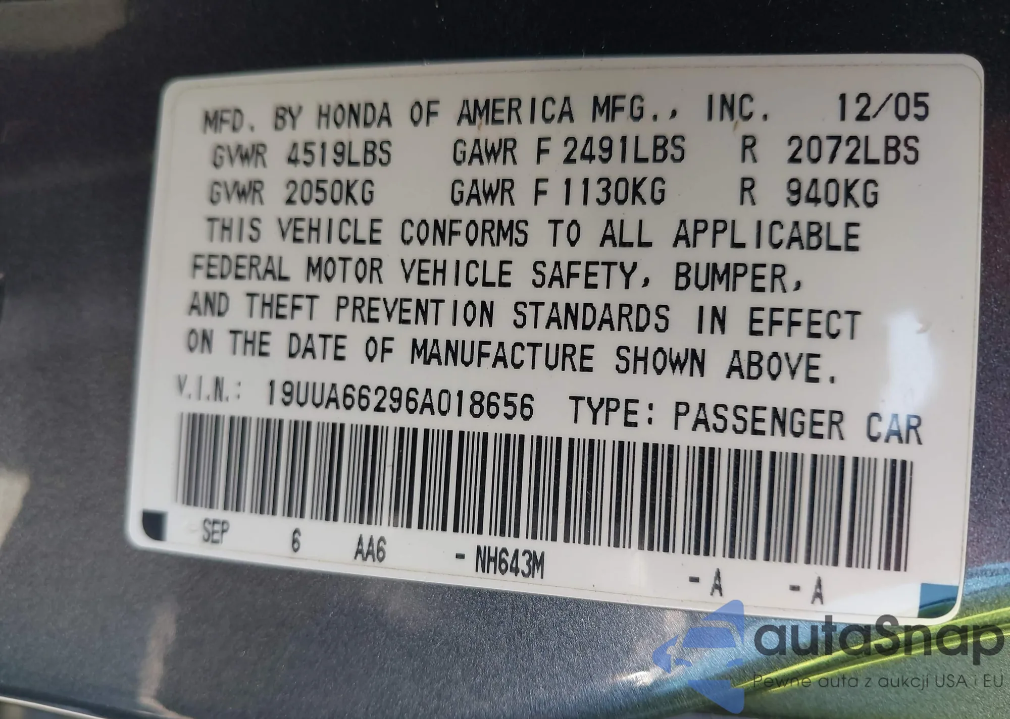 • VIN 19UUA66296A018656