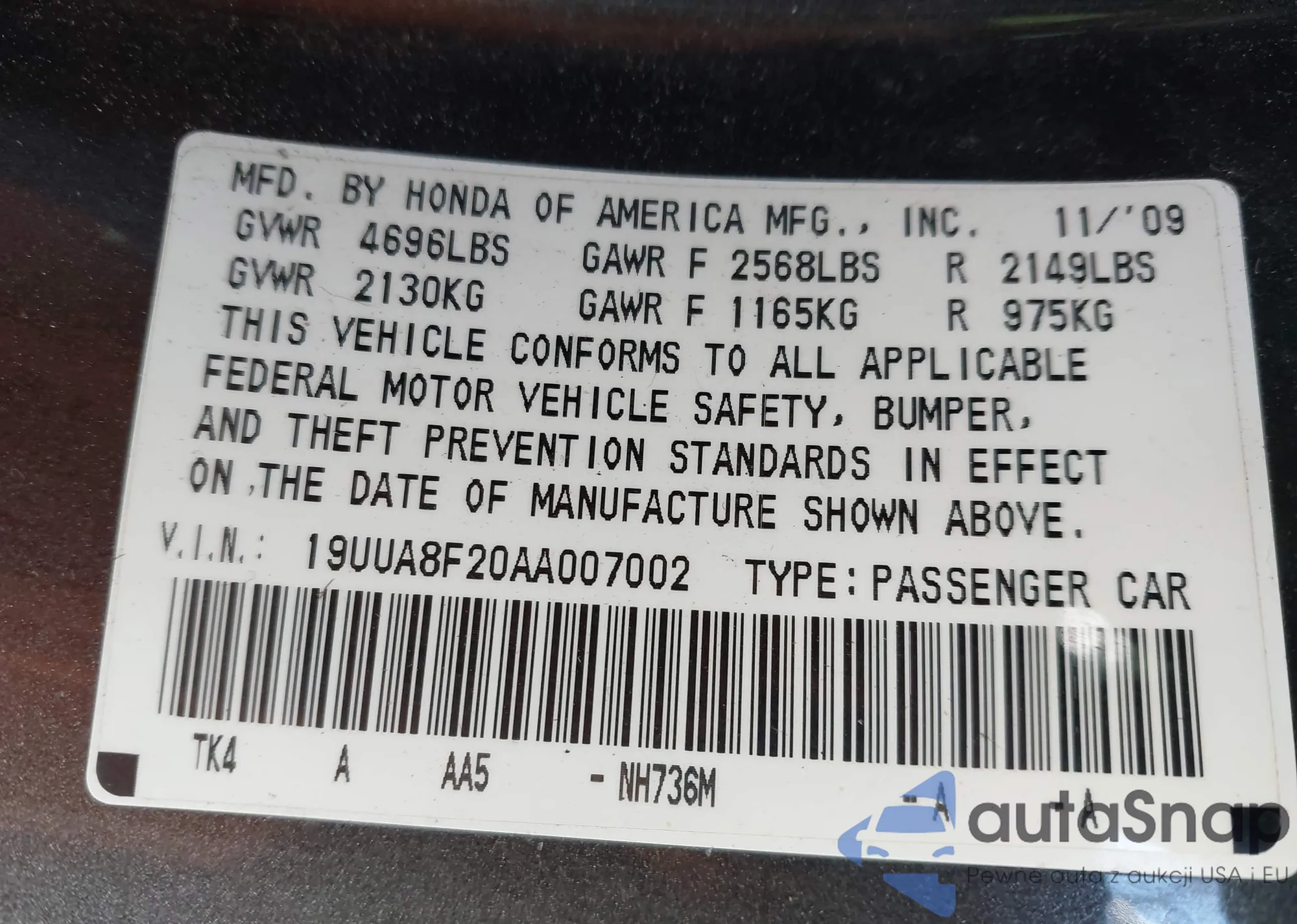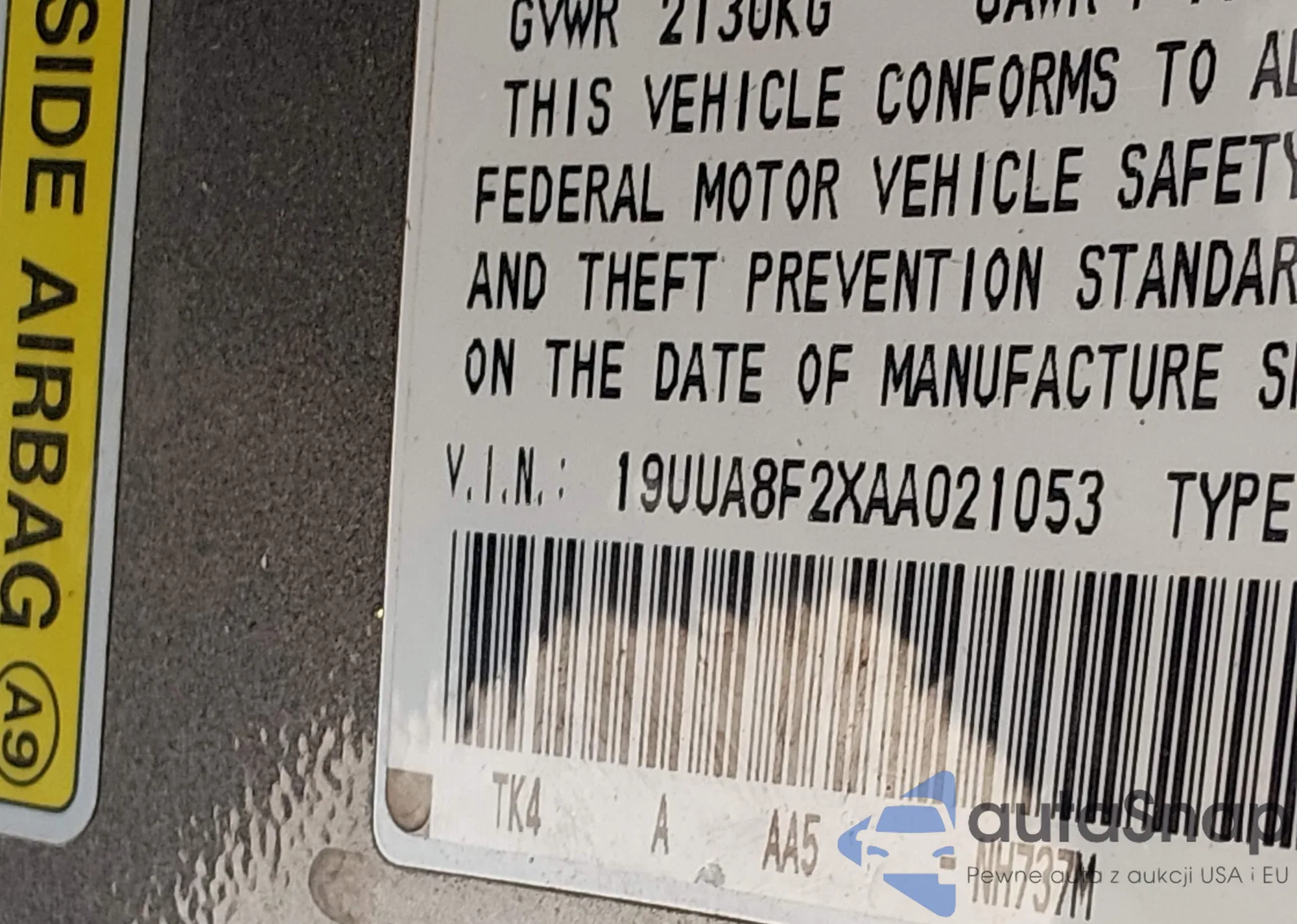 • VIN 19UUA8F20AA007002