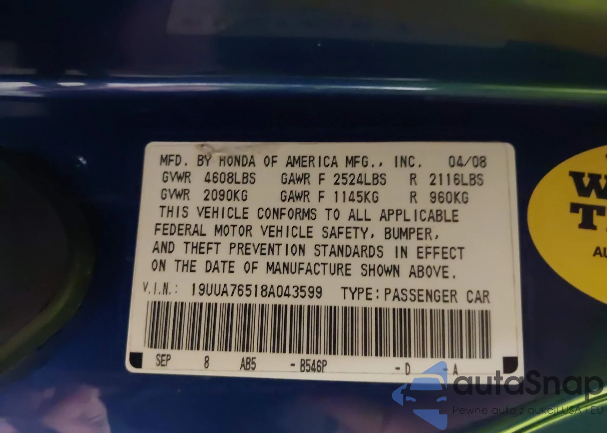 • VIN 19UUA76518A043599