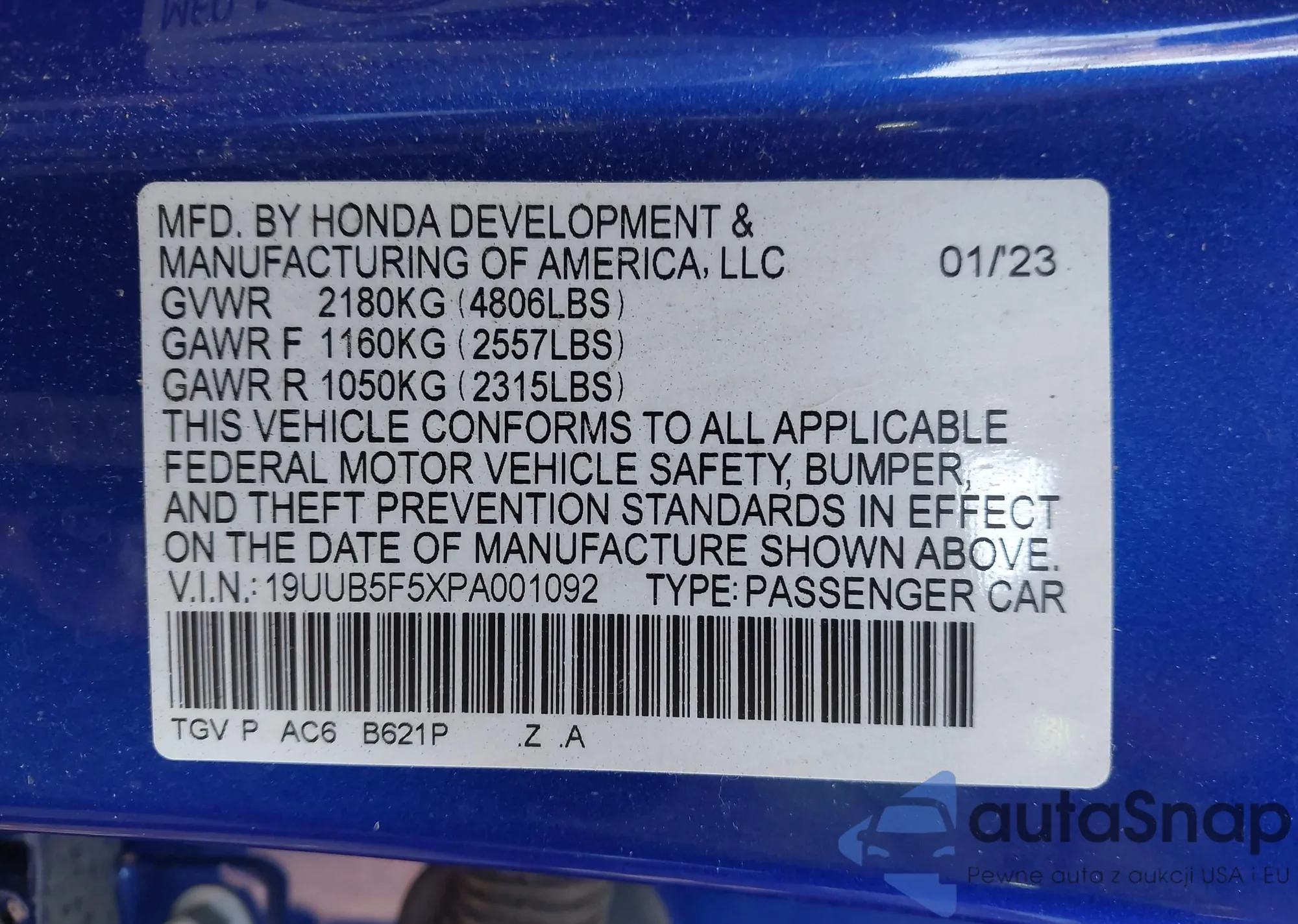 LOT: 43557980 VIN: 19UUB5F5XPA001092