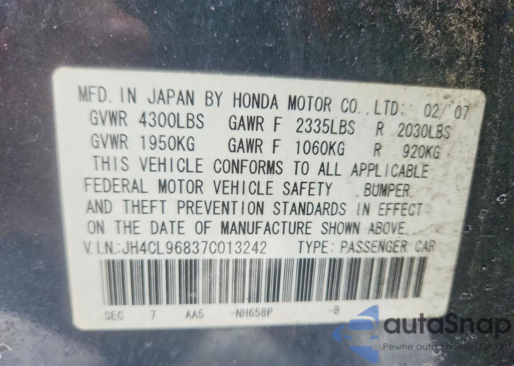 LOT: 73018215 VIN: JH4CL96837C013242