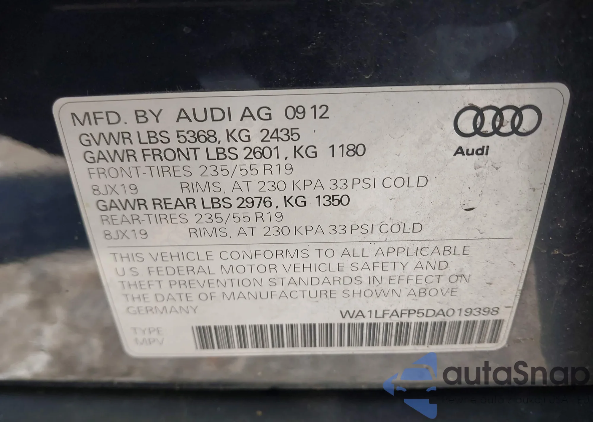 • VIN WA1LFAFP5DA019398