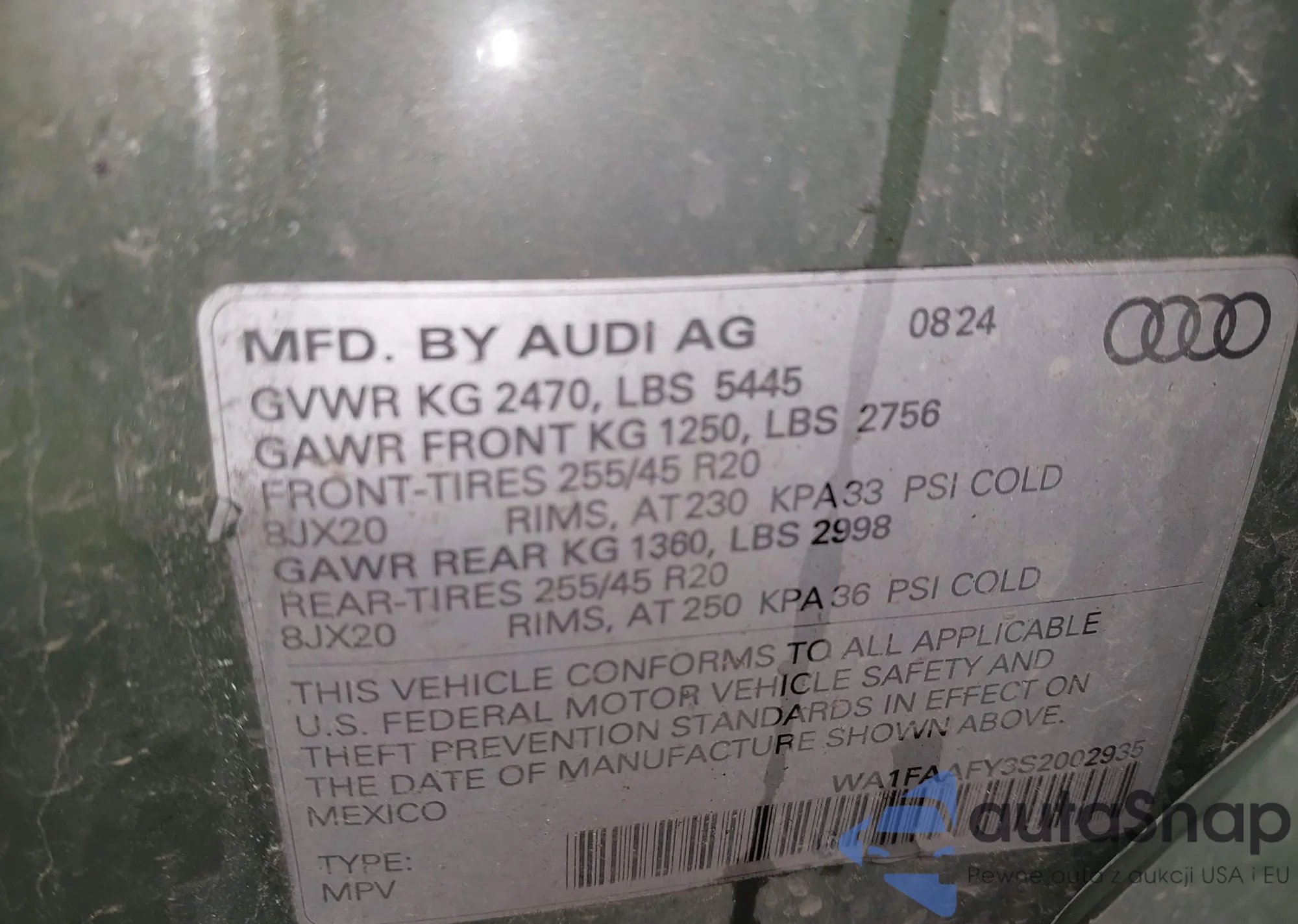 LOT: 43597972 VIN: WA1FAAFY3S2002935