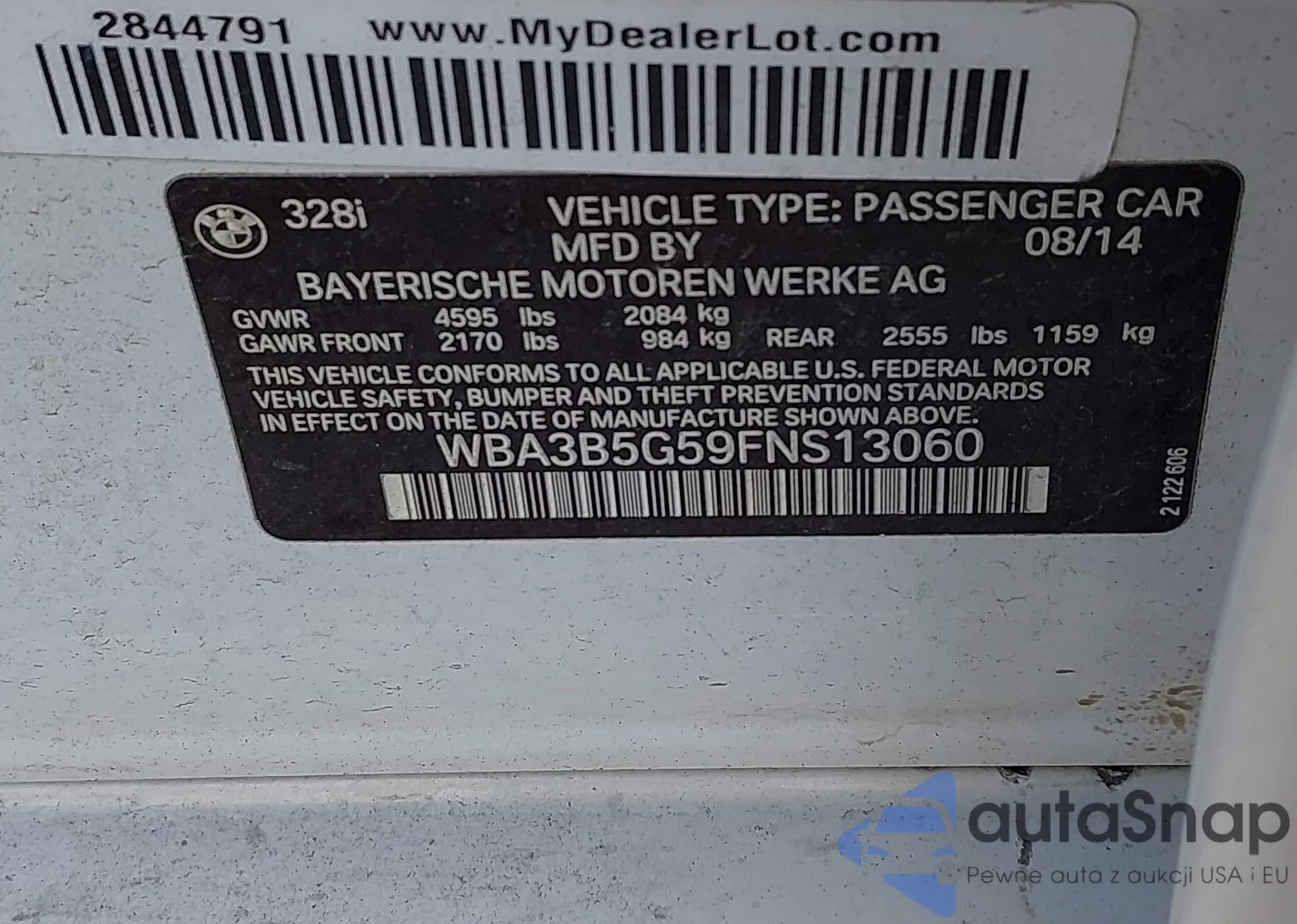 LOT: 44001245 VIN: WBA3B1G59FNT02166