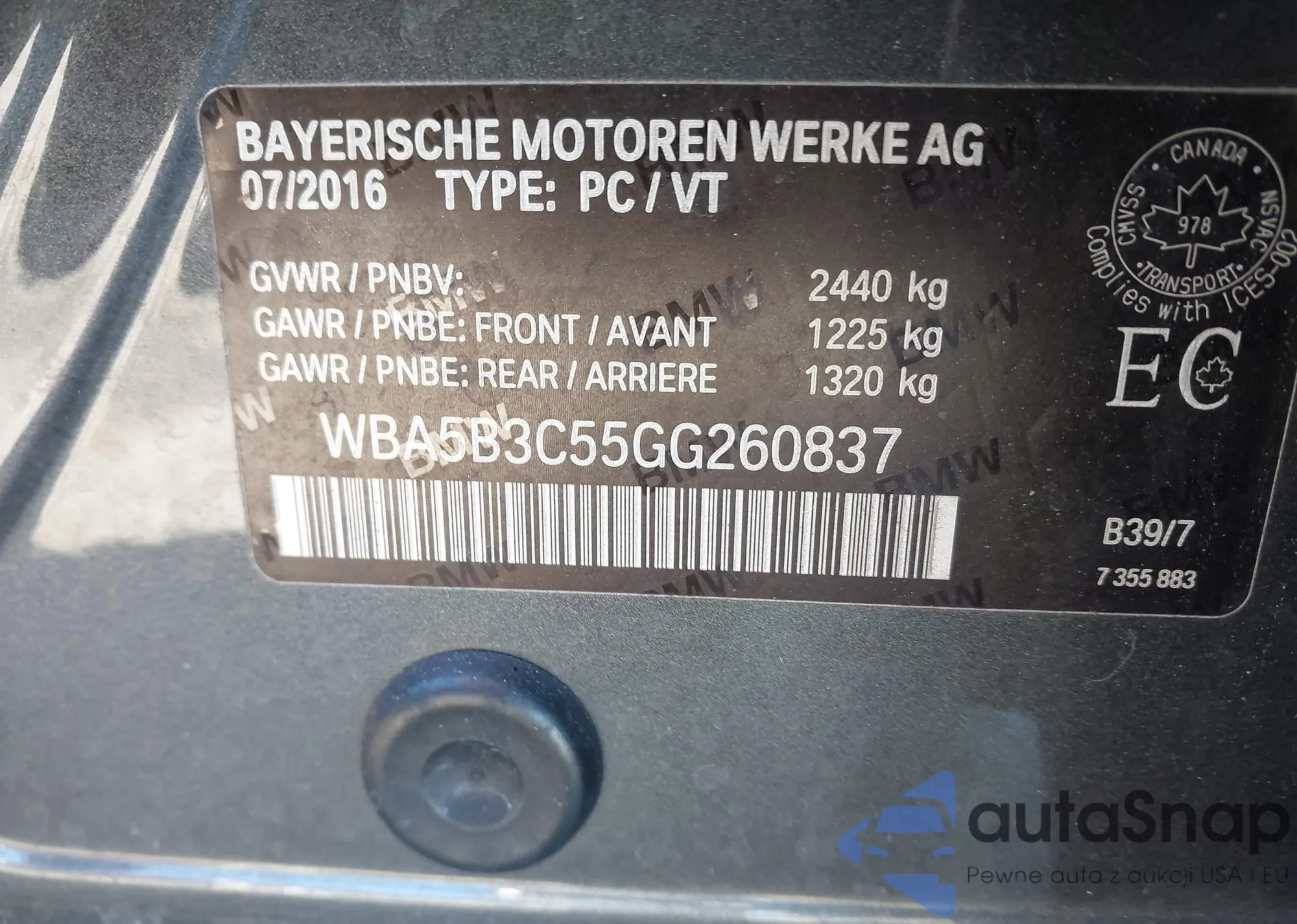 LOT: 44159357 VIN: WBA5B3C55GG260837