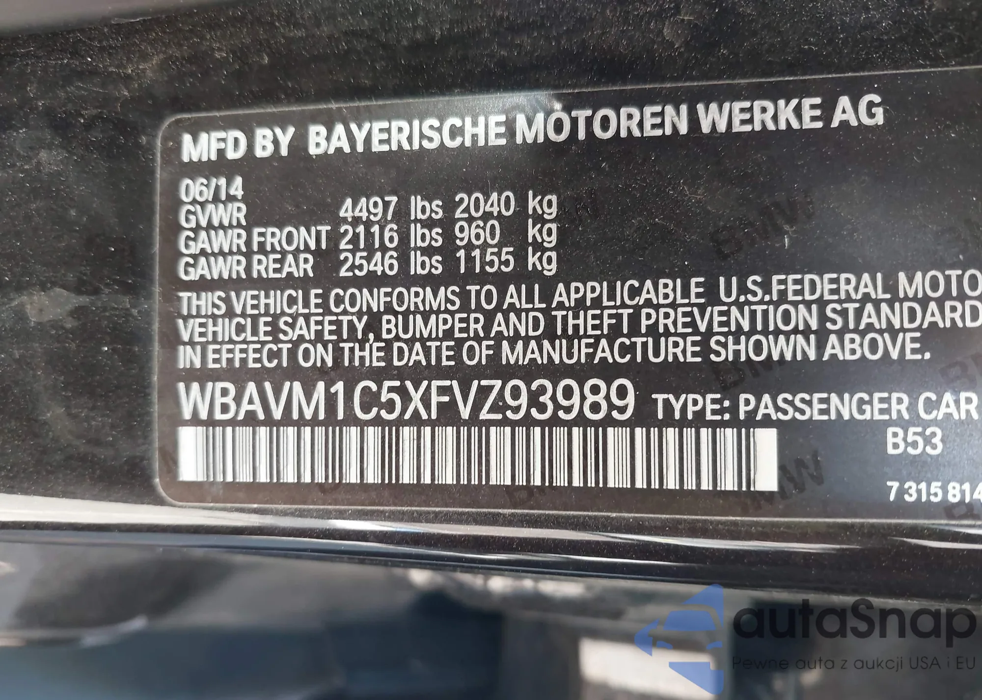 • VIN WBAVM1C5XFVZ93989