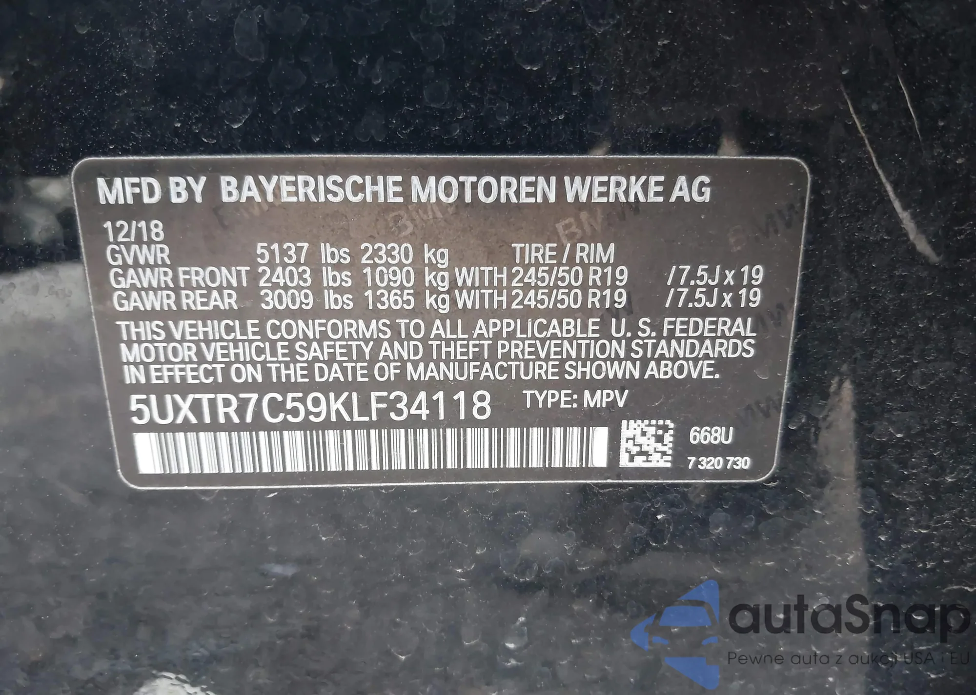 LOT: 44076707 VIN: 5UXTR7C59KLF34118