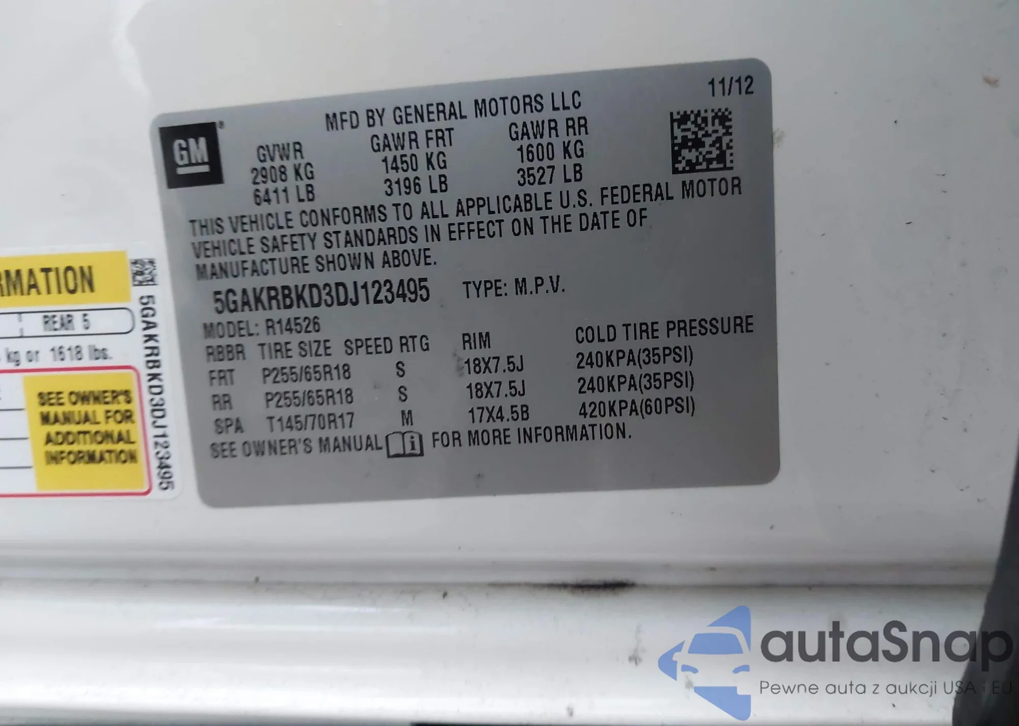 LOT: 43748727 VIN: 5GAKRBKD3DJ123495