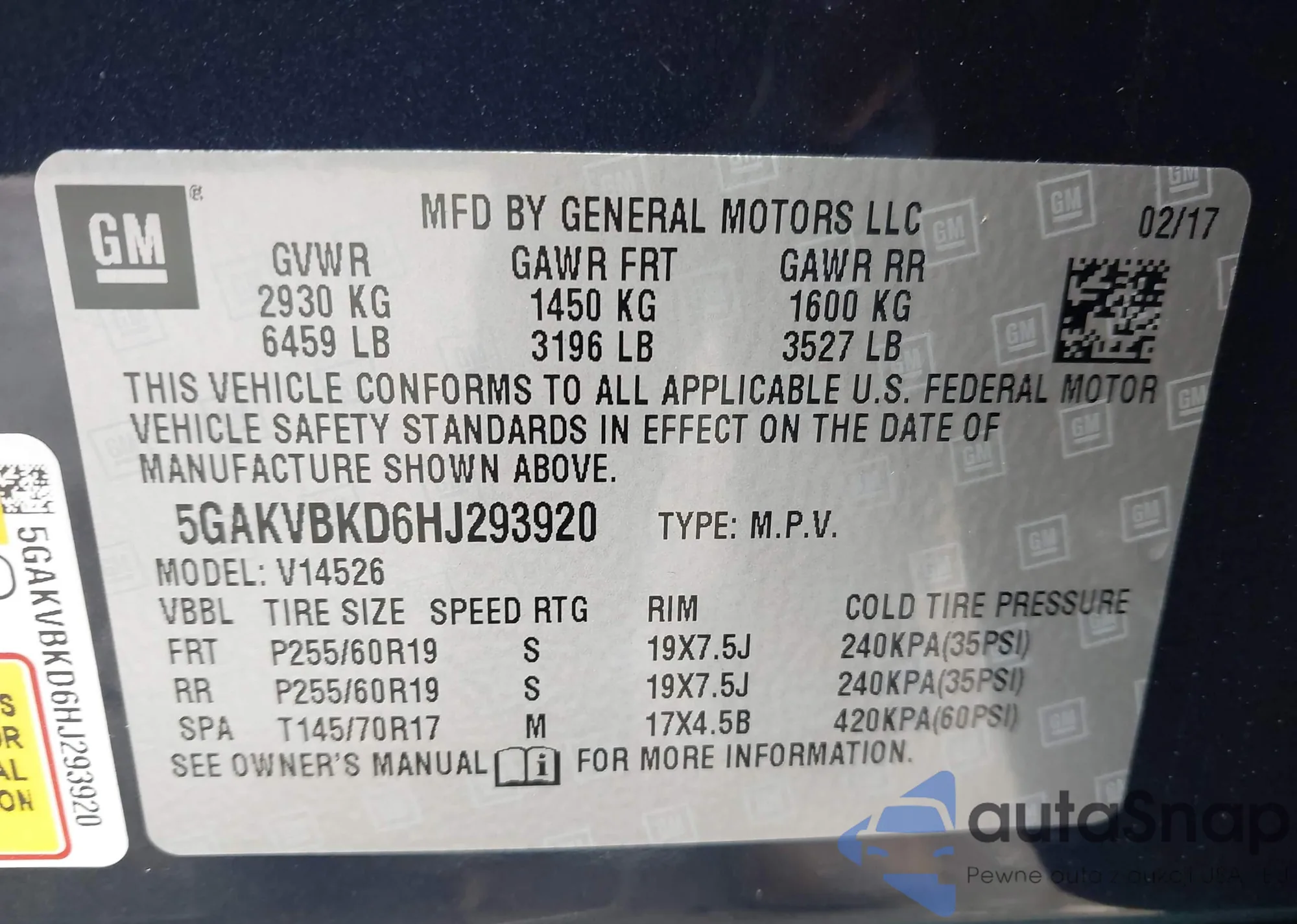 • VIN 5GAKVBKD6HJ293920