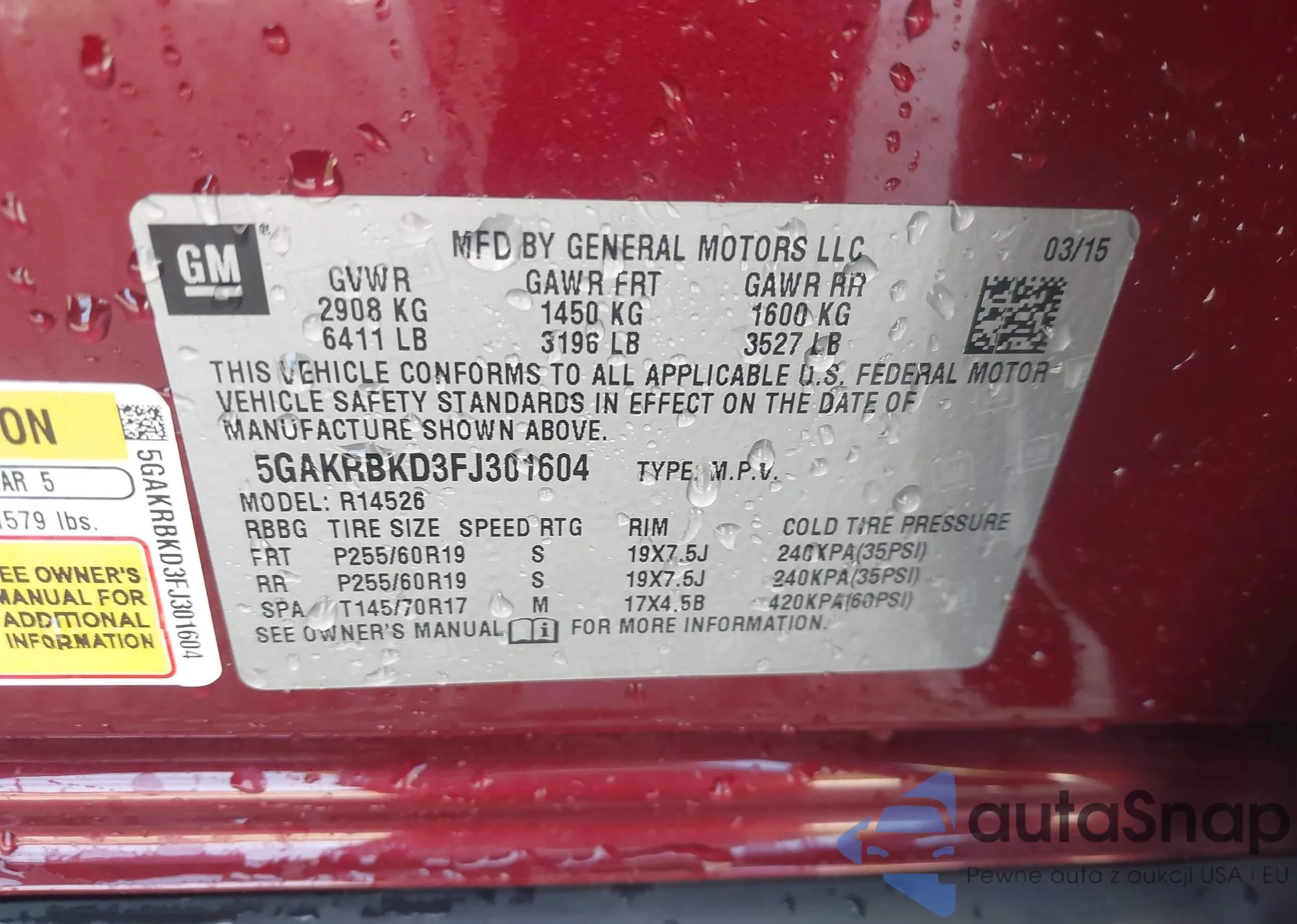 LOT: 43346611 VIN: 5GAKRBKD3FJ301604