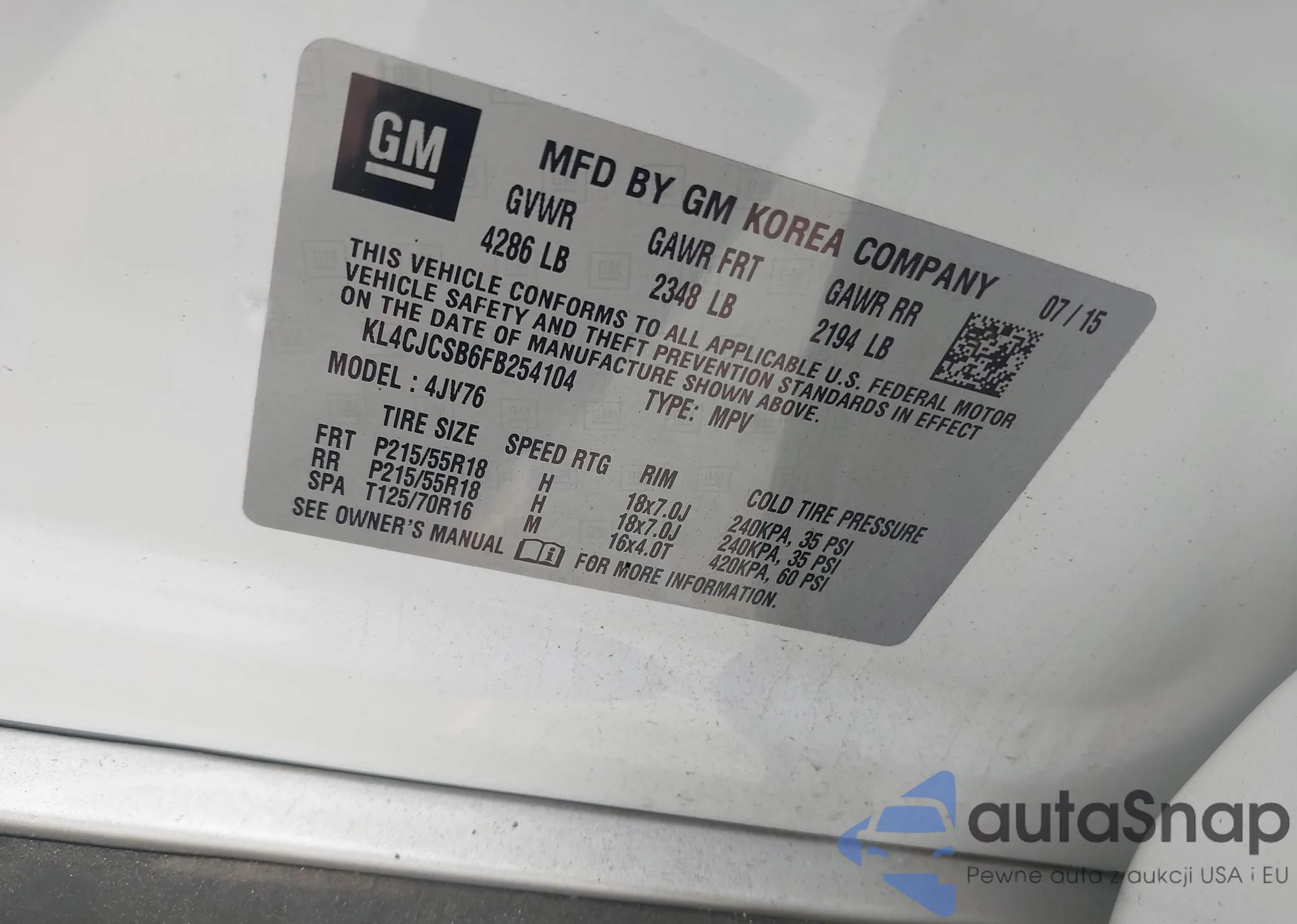 • VIN KL4CJCSB6FB254104