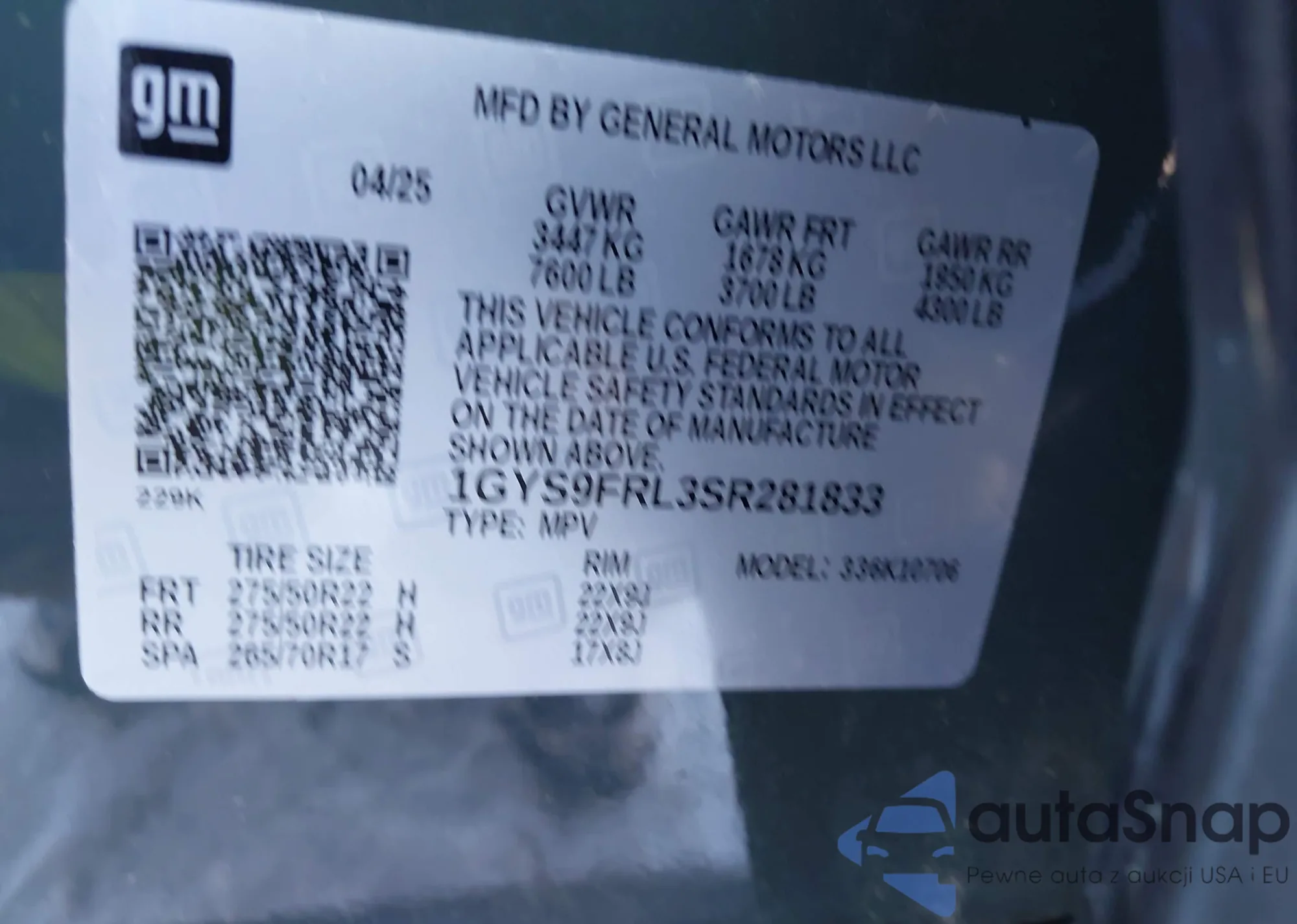 • VIN 1GYS9FRL3SR281833