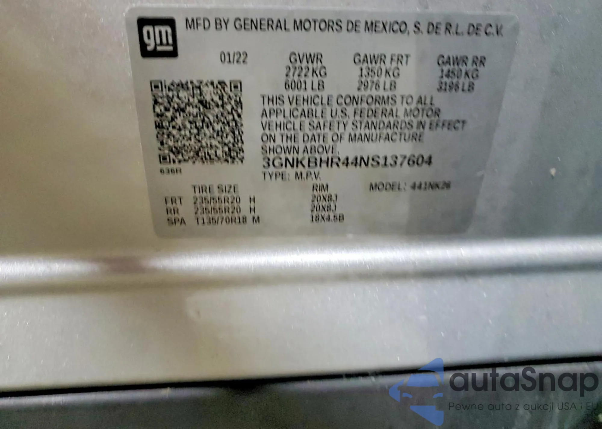 LOT: 43931851 VIN: 3GNKBCR42NS171804