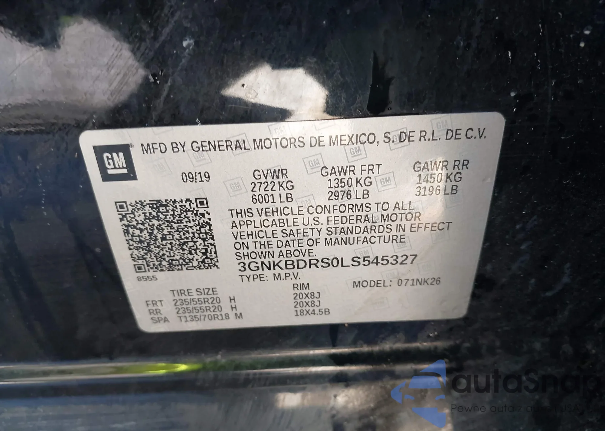 LOT: 43937460 VIN: 3GNKBDRS0LS545327