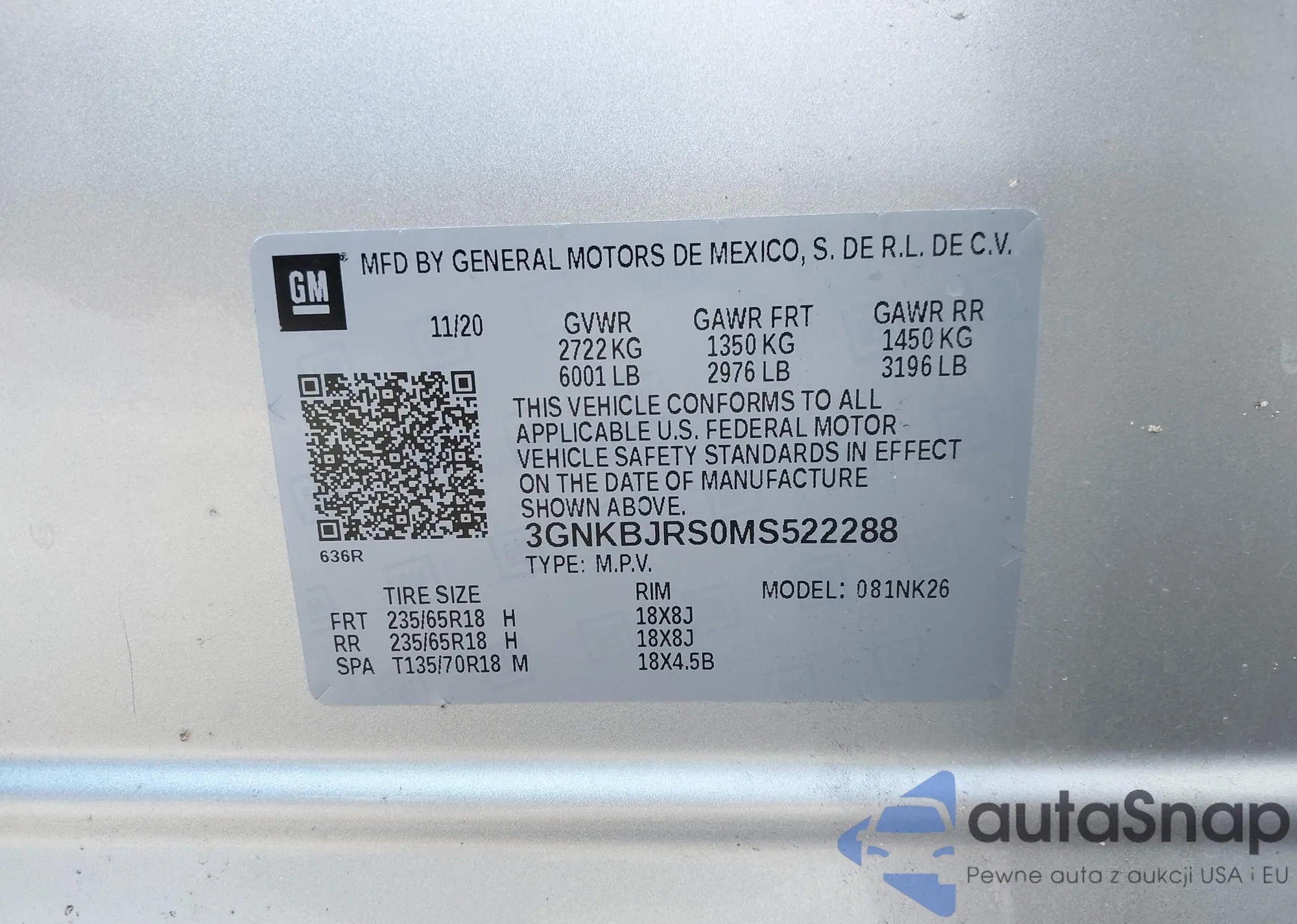 LOT: 43493979 VIN: 3GNKBJRS0MS522288
