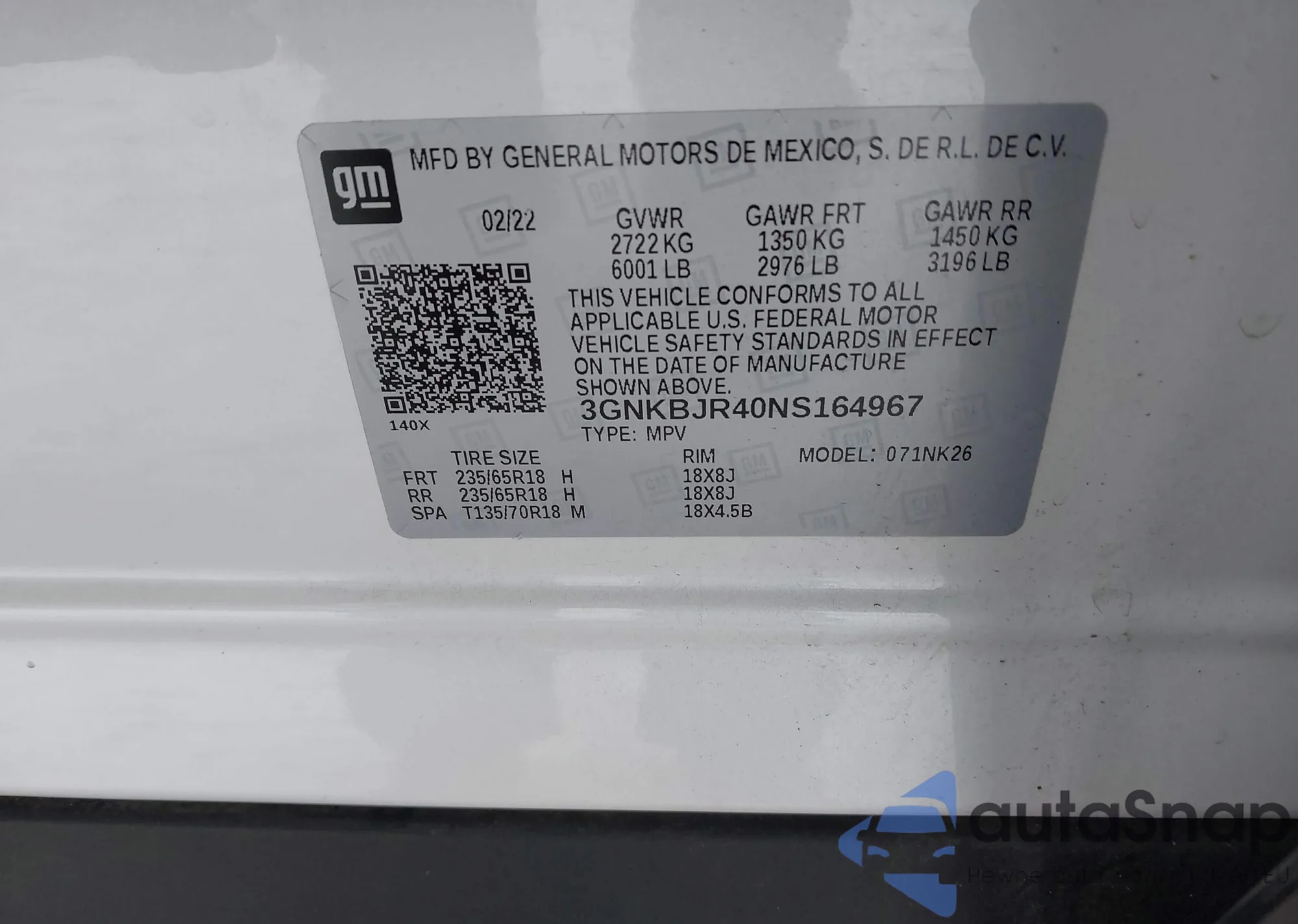 • VIN 3GNKBJR40NS164967