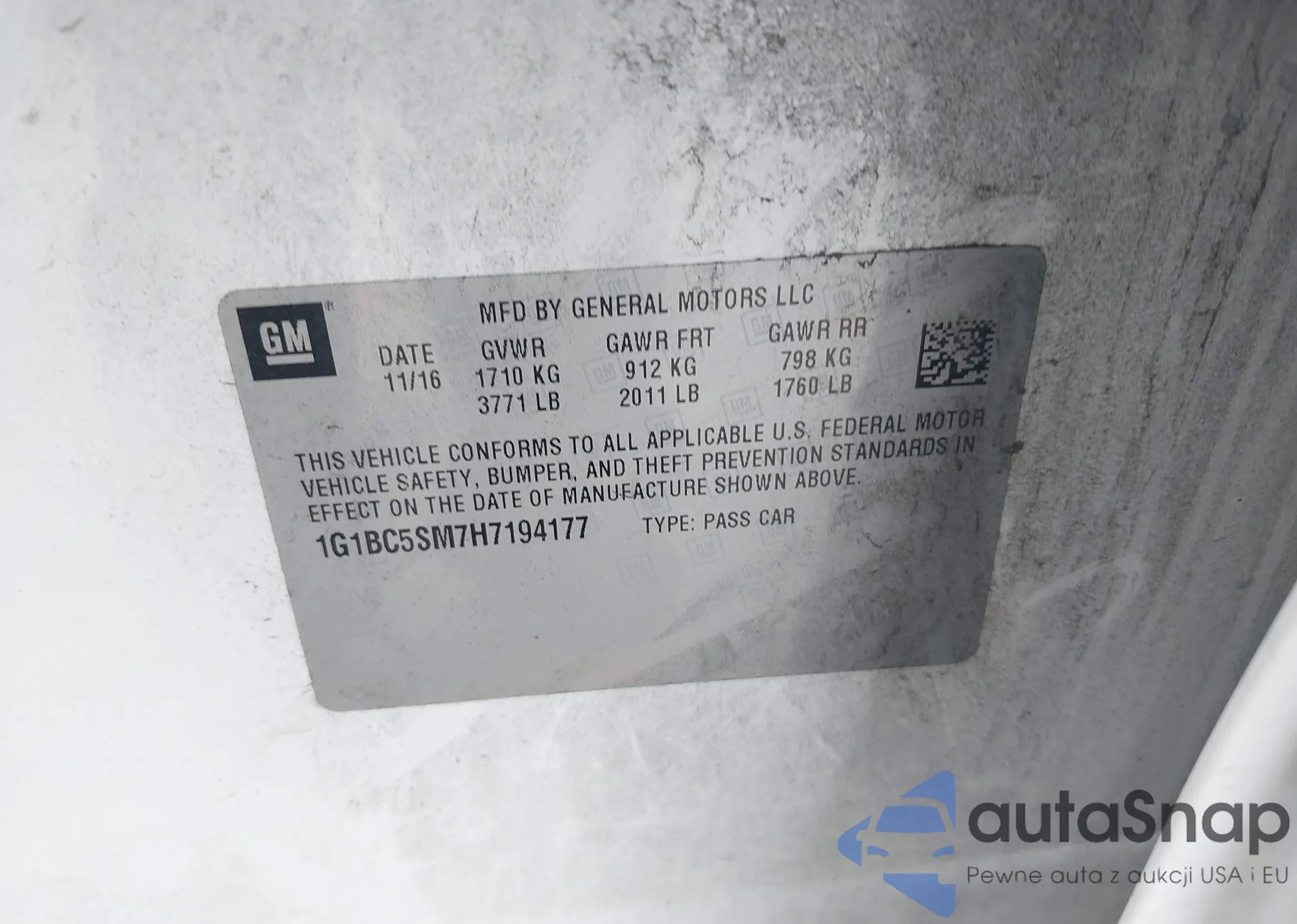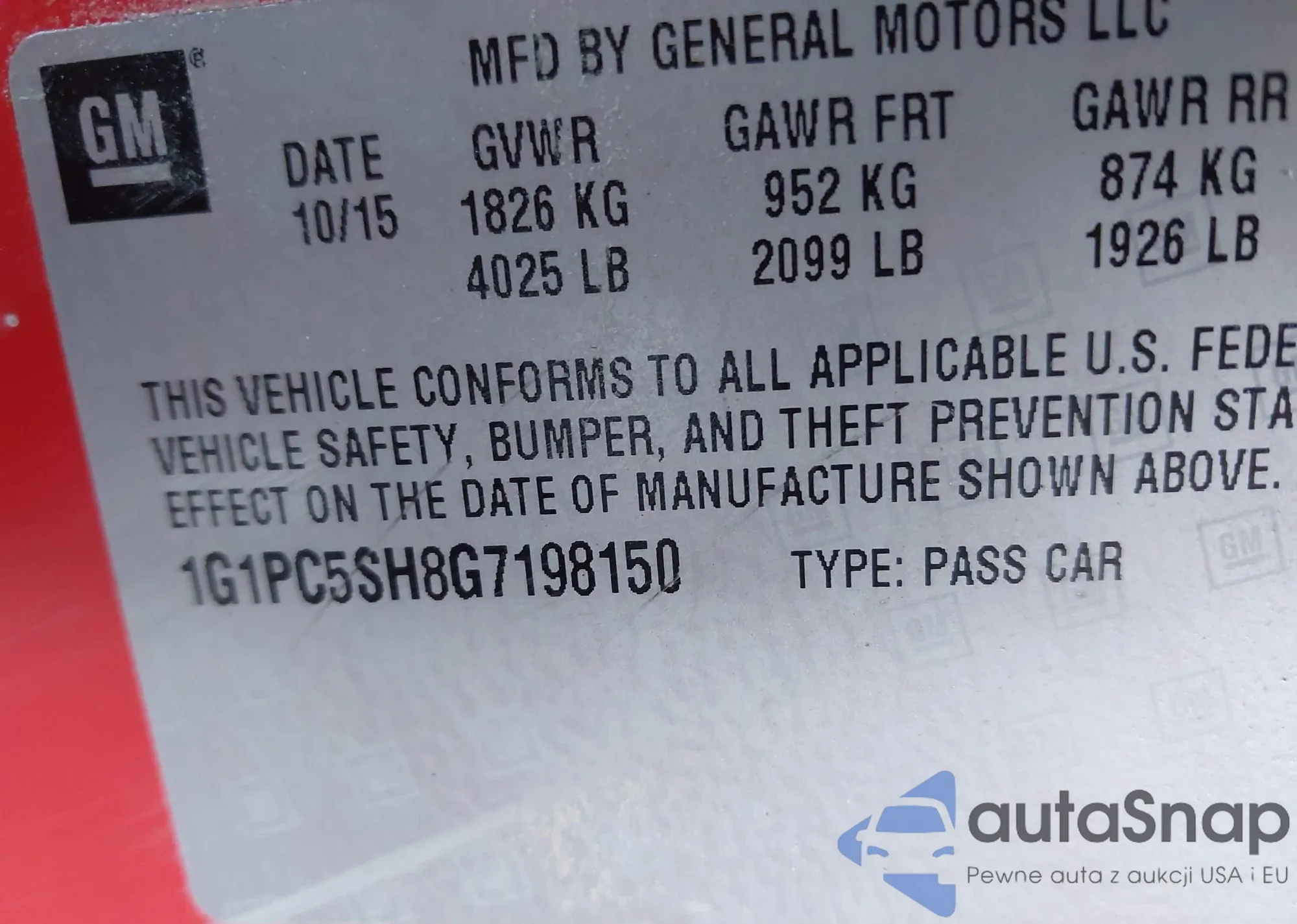 LOT: 43471710 VIN: 1G1PC5SH8G7198150