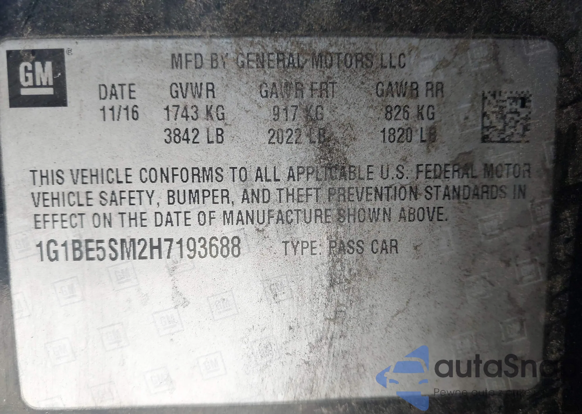 LOT: 43893223 VIN: 1G1BE5SM2H7193688