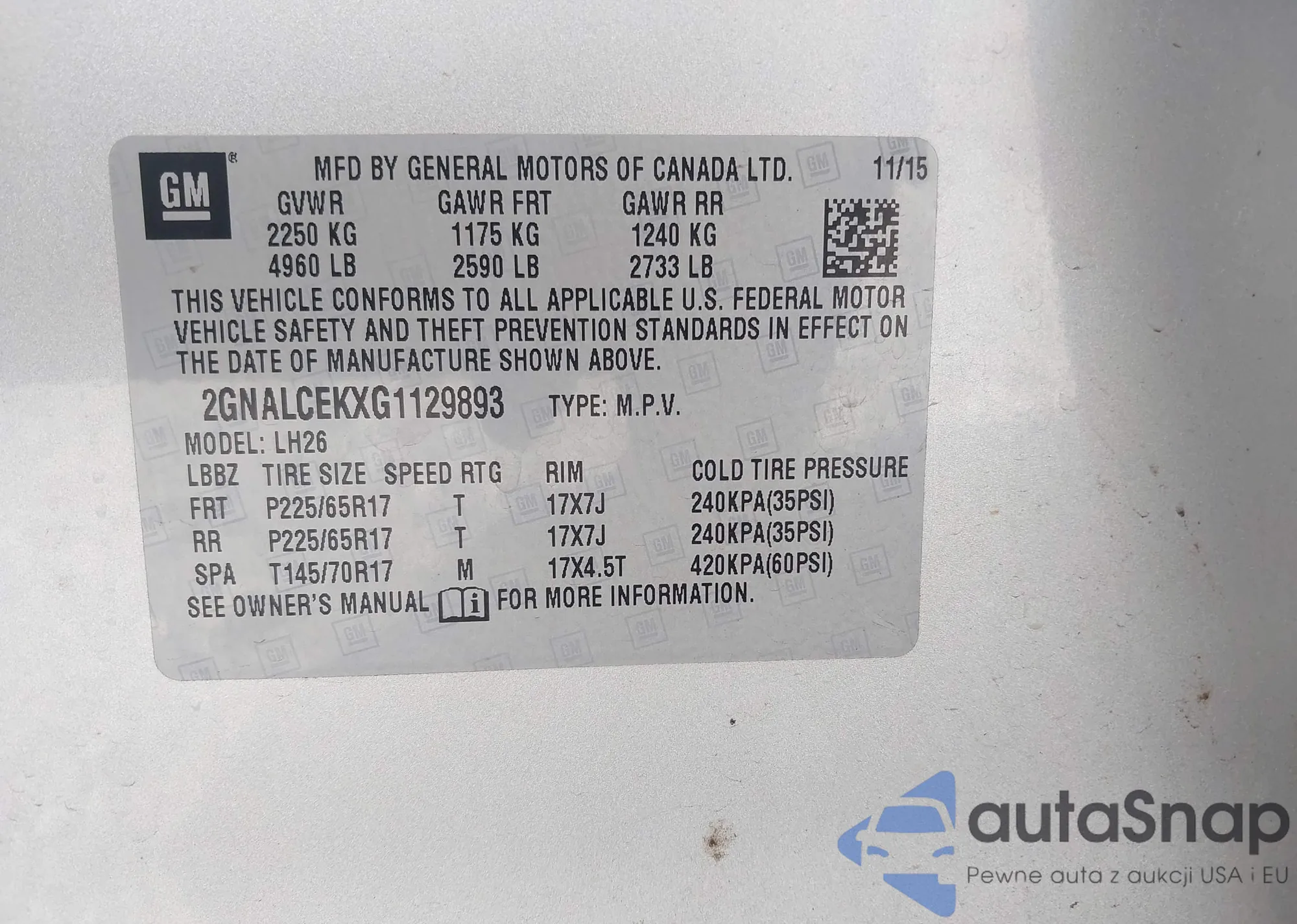 LOT: 44114635 VIN: 2GNALCEKXG1129893