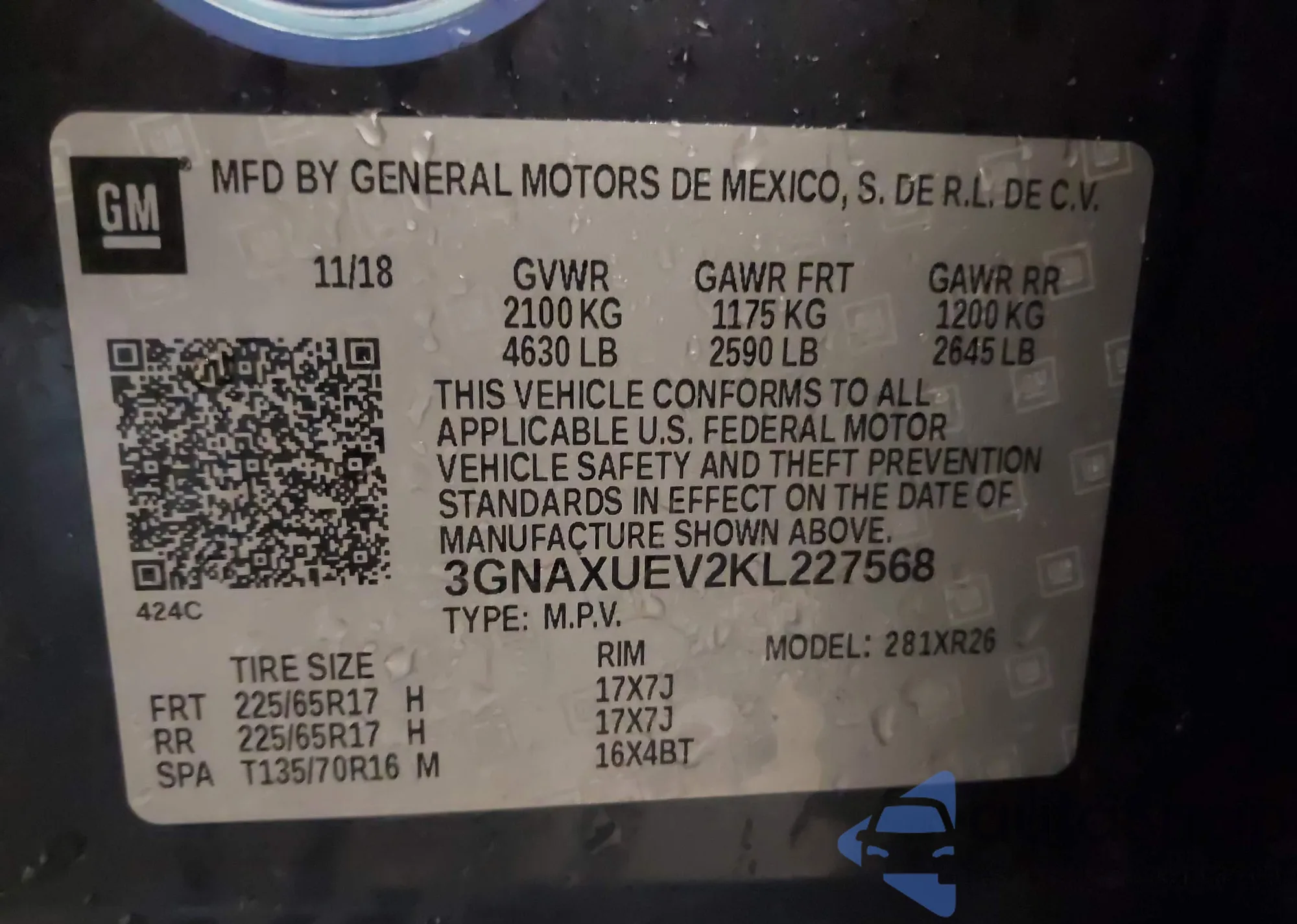 • VIN 3GNAXUEV2KL227568