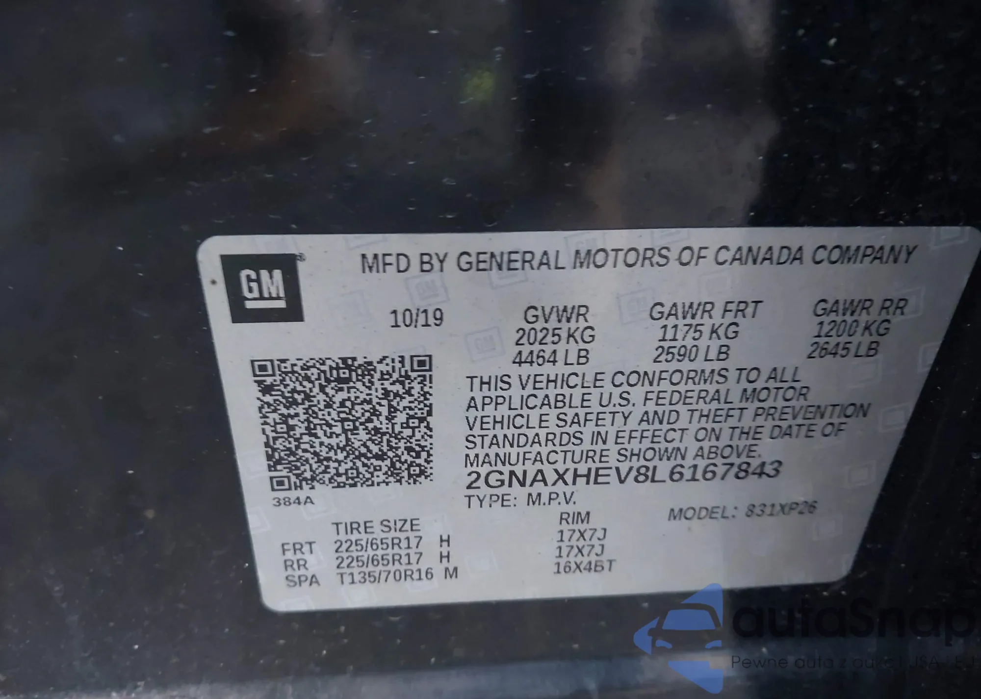 LOT: 43846810 VIN: 2GNAXHEV8L6167843