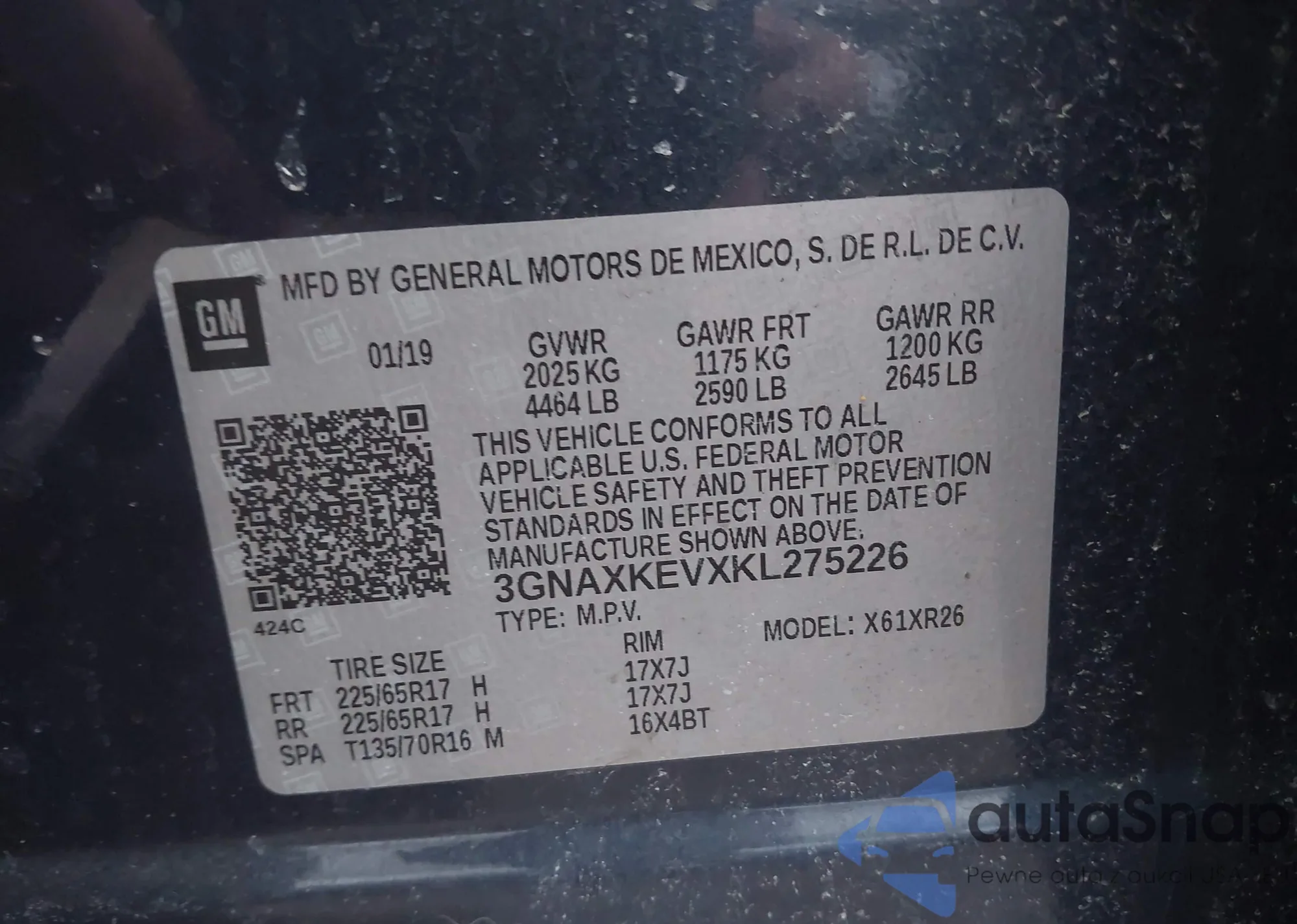 • VIN 3GNAXKEVXKL275226