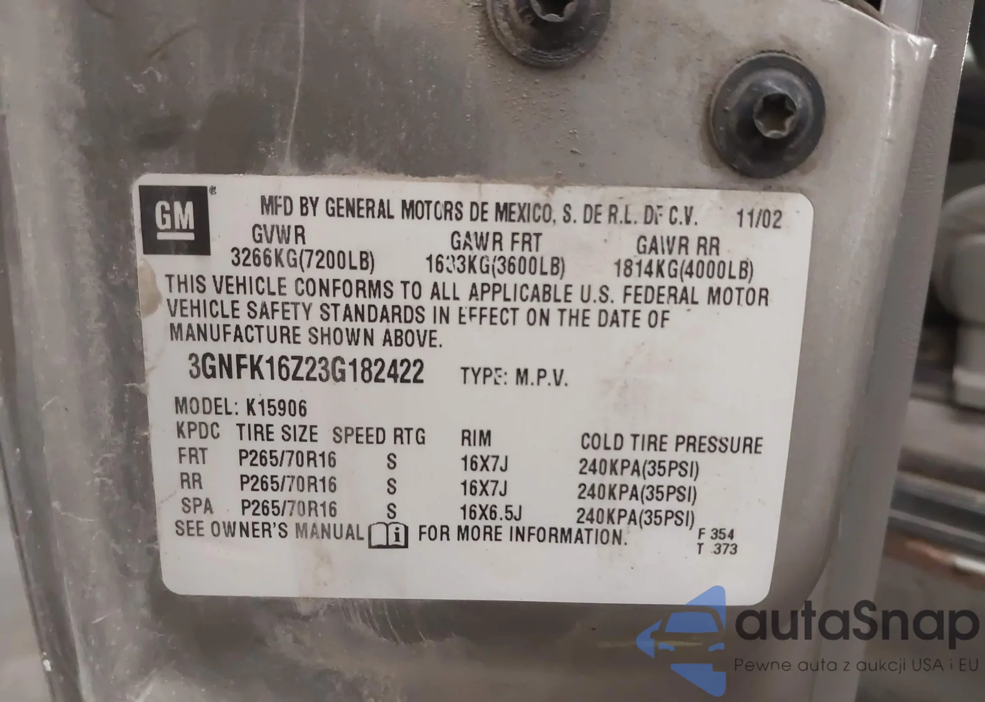• VIN 3GNFK16Z23G182422