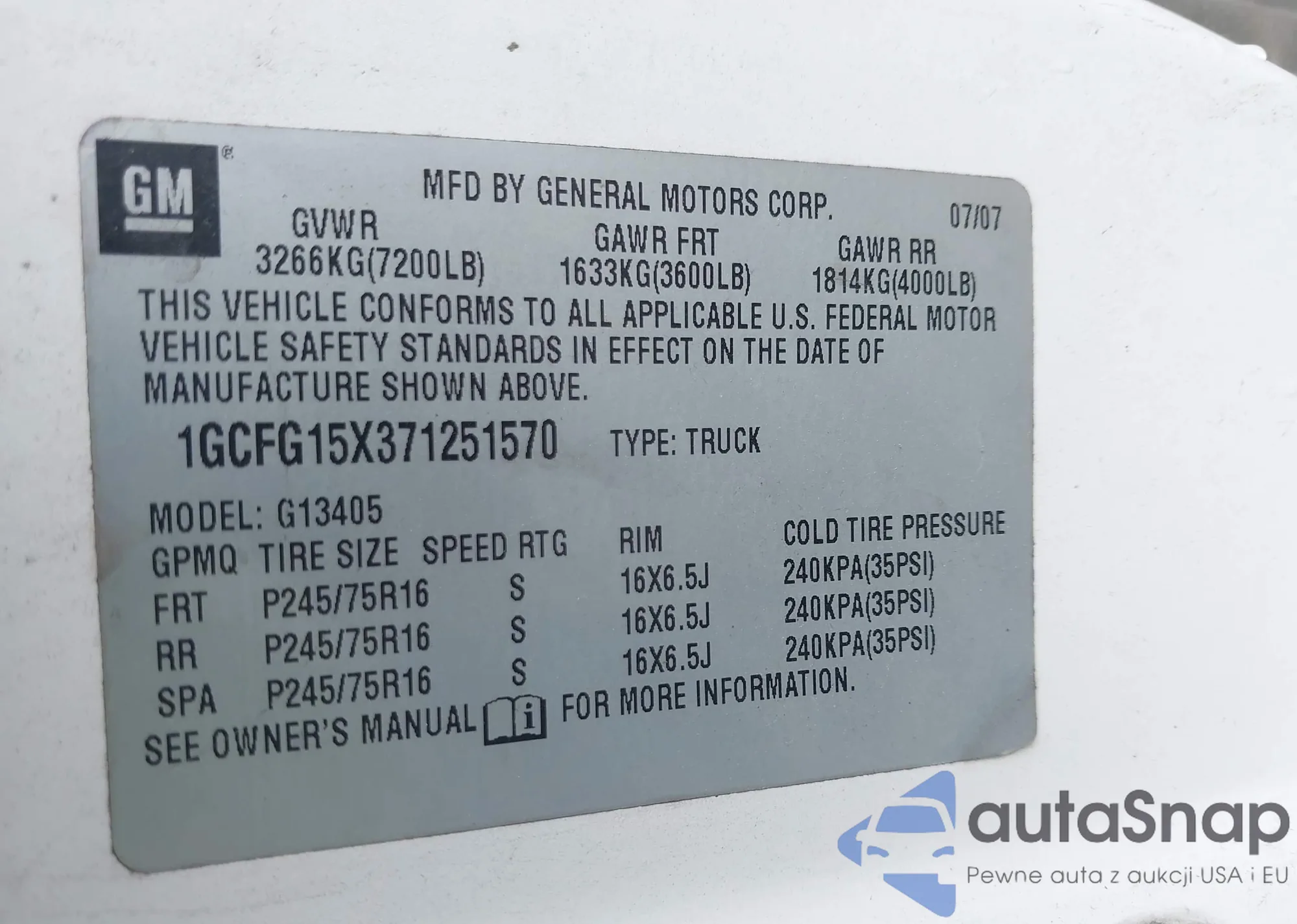 • VIN 1GCFG15X371251570