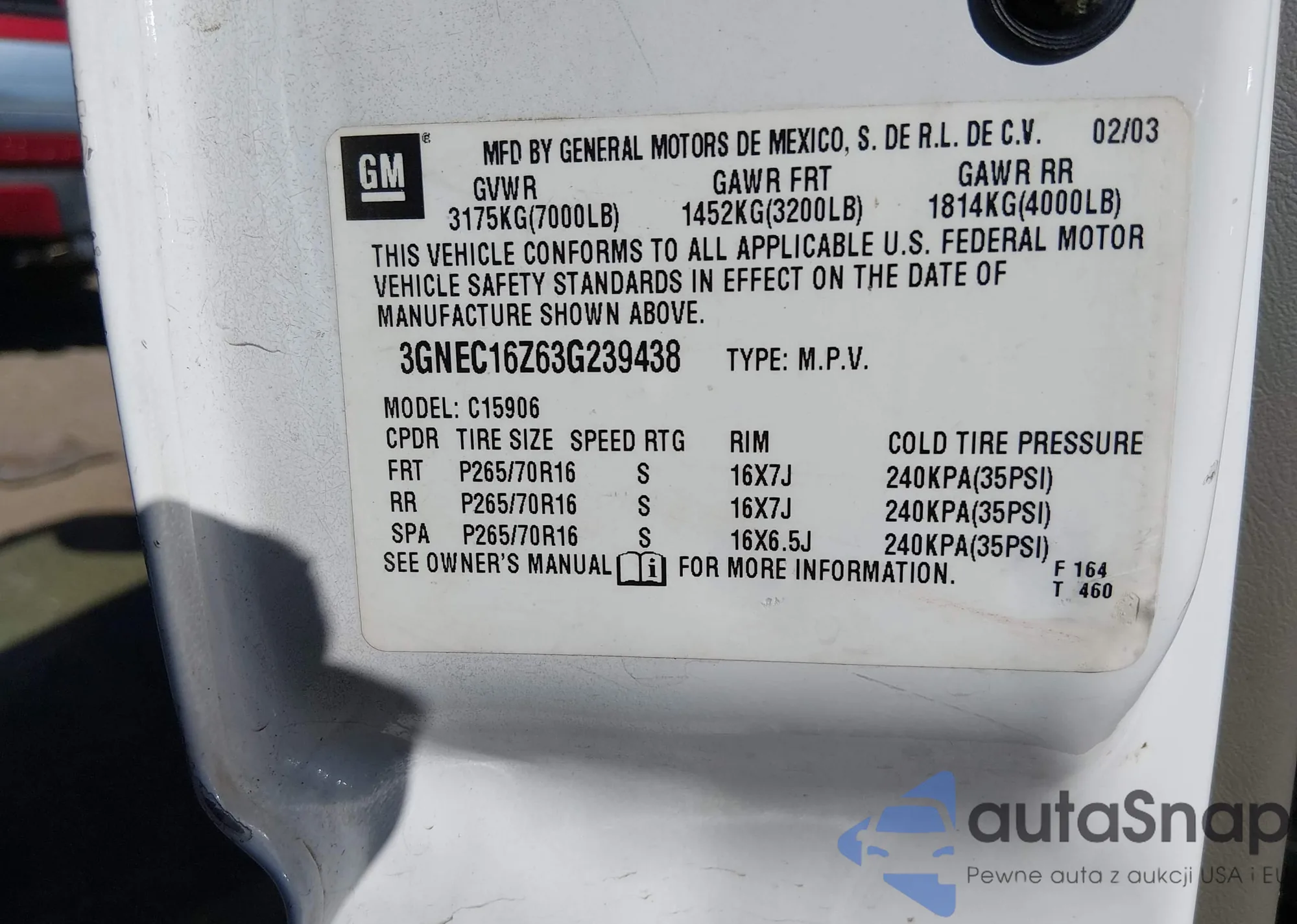 • VIN 3GNEC16Z63G239438
