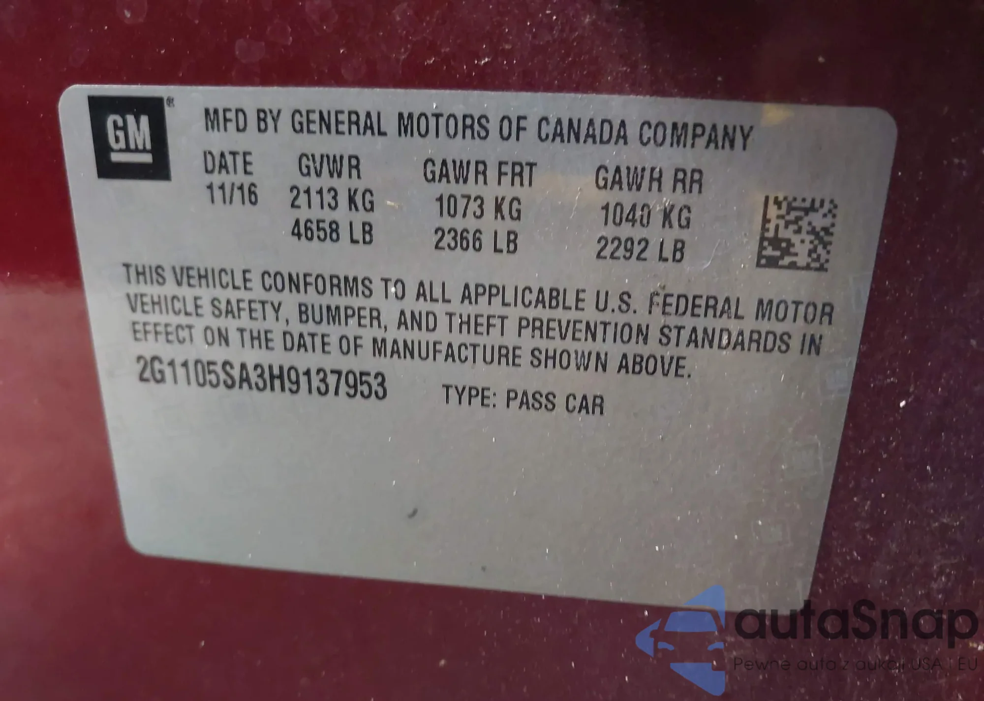 • VIN 2G1105SA3H9137953