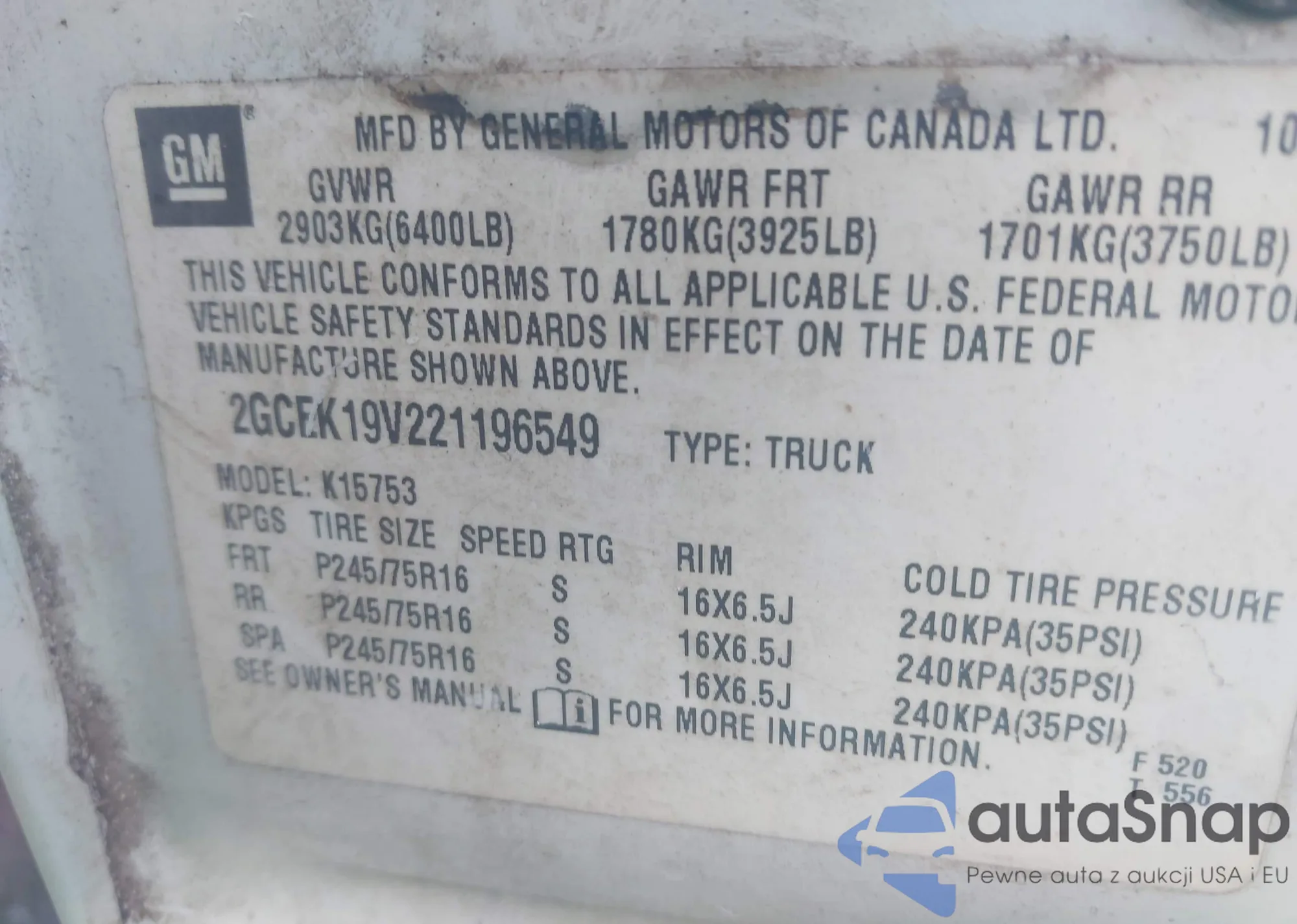 • VIN 2GCEK19V221196549