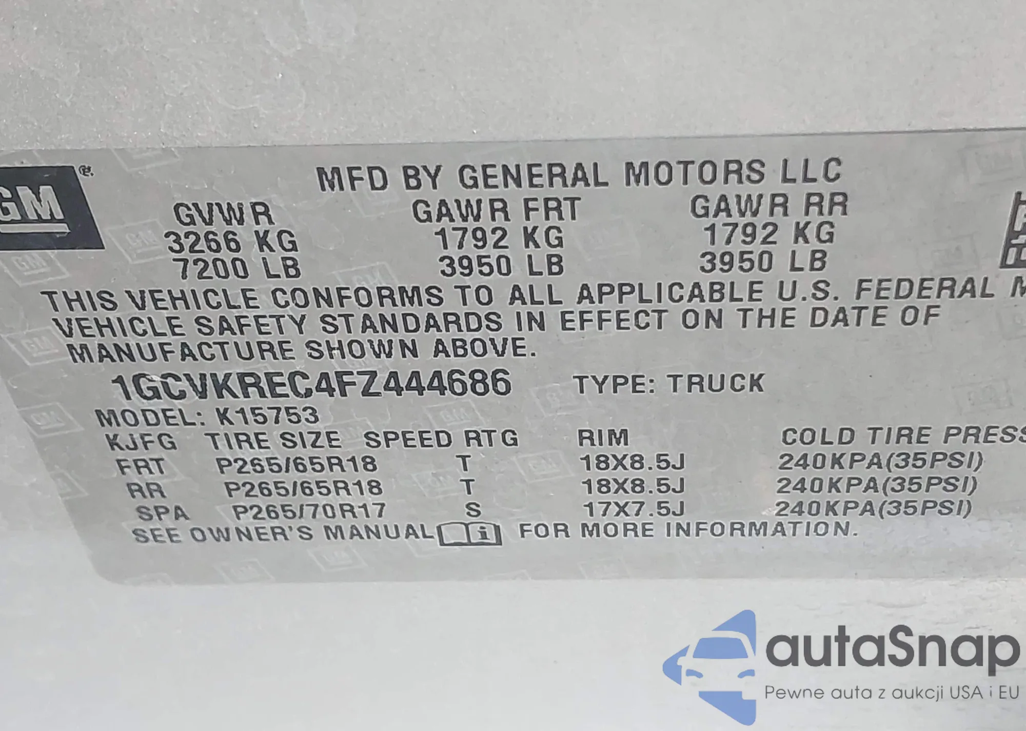 LOT: 43750270 VIN: 1GCVKREC4FZ444686